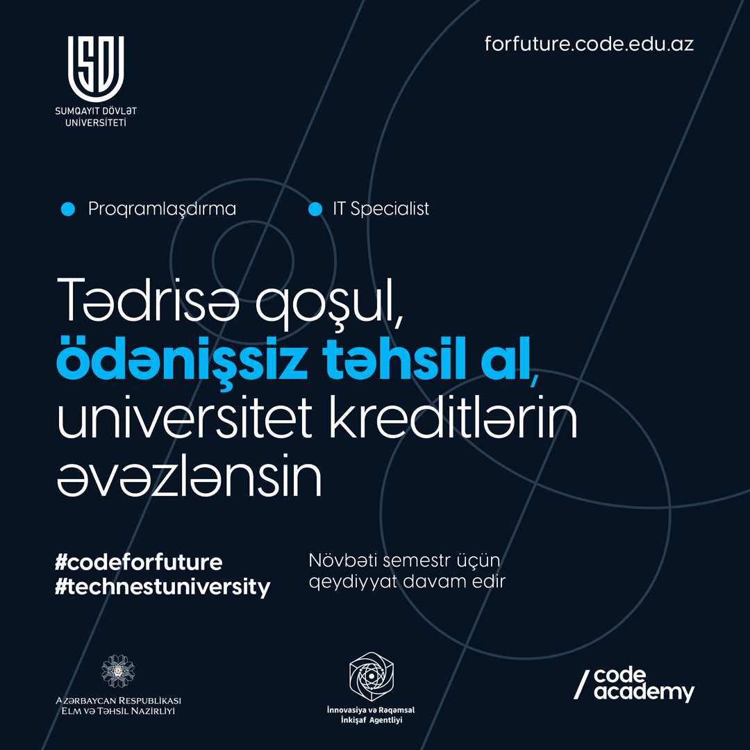 Hörmətli SDU tələbələri, “Code Academy” ilə Elm və Təhsil Nazirliyinin birgə həyata keçirdiyi #CodeForFuture layihəsinin təqaüdlü təhsil imkanını qaçırma! Əgər siz də İnformasiya Texnologiyalari (IT), Proqramlaşdırma ixtisasları üzrə təhsil almaq istəyirsinizsə, heç bir ödəniş etmədən, hətta uyğun universitet kreditlərini əvəz ətməklə təhsil almaq şansını əldə edə biləcəksiniz. Qeyd edək ki, dərslər 2024-2025-ci tədris ilinin payız semestrində başlayacaq. Qeydiyyat üçün link: https://code.edu.az/forfuture/