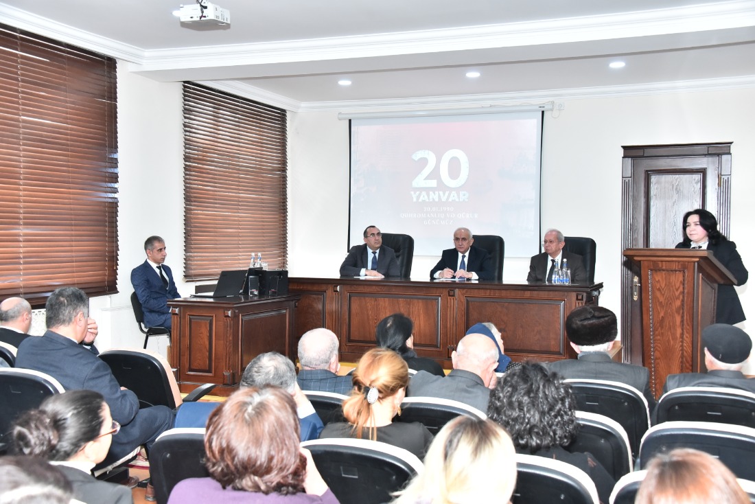 Tədbiri giriş sözü ilə açan universitetin rektoru professor Elxan Hüseynov 1990-cı ilin yanvarın 19-dan 20-nə keçən gecə Azərbaycanda törədilən qanlı hadisələrin tarixindən danışdı, Vətənimizin müstəqilliyi, suverenliyi, azadlığı uğrunda canını qurban verən şəhidlərimizin adının əbədi olaraq Azərbaycan tarixinə və xalqımızın yaddaşına həkk olunduğunu bildirdi. Diqqətə çatdırdı ki, SSRİ rəhbərliyinin Azərbaycana qarşı qərəzli, ermənipərəst siyasətinə, əzəli torpaqlarımıza iddia edən Ermənistanın təcavüzkar siyasətinin açıq-aşkar dəstəklənməsinə və respublikanın ozamankı rəhbərliyinin xəyanətkar mövqeyinə etiraz əlaməti olaraq ayağa qalxmış geniş xalq kütlələrinə qarşı sovet ordusunun iri hərbi birləşmələrinin yeridilməsi Azərbaycanda, xüsusilə Bakıda misli görünməmiş faciəyə gətirib çıxardı, böyük itkilərlə, günahsız insanların ölümü ilə nəticələndi. Milli azadlığı, ölkəsinin ərazi bütövlüyü uğrunda mübarizəyə qalxan dinc əhaliyə divan tutulması, kütləvi terror nəticəsində yüzlərlə günahsız insanın qətlə yetirilməsi və yaralanması totalitar sovet rejiminin süqutu ərəfəsində onun cinayətkar mahiyyətini bütün dünyaya bir daha nümayiş etdirdi. Rektor onu da vurğuladı ki, 20 Yanvar faciəsindən bir gün sonra Ulu öndər Heydər Əliyevin Azərbaycanın Moskvadakı səfirliyinə gedərək xalqımızın kədərini bölüşməsi və qırmızı rejimin ölkəmizdə həyata keçirdiyi qanlı aksiyanı ifşa etməsi o dövrdə xalqımıza bir dayaq, bir təsəlli oldu. Xalq o ağır günlərdə köməksiz olmadığını hiss etdi.Uzun illər Azərbaycan Kommunist Partiyası Mərkəzi Komitəsinin birinci katibi, SSRİ Nazirlər Soveti sədrinin birinci müavini vəzifələrində işləyən, Sovet İttifaqı Kommunist Partiyası Mərkəzi Komitəsinin Siyasi Bürosunun üzvü olan, SSRİ rəhbərliyinin qəzəbinə tuş gələrək təqaüdə göndərilən Heydər Əliyev yenə də bütün məhrumiyyətlərə baxmayaraq, o ağır günlərdə xalqının sırasında, onunla birgə, həmrəy oldu. Heydər Əliyev bəyanatı ilə əslində Azərbaycanda gedən proseslərə qiymət verdi. Məhz ümummilli liderin 1993-cü ildə siyasi hakimiyyətə qayıdışından sonra 20 Yanvar faciəsinin baş verməsinin səbəblərinin araşdırılması və onu törədənlərin məsuliyyətə cəlb olunması istiqamətində mühüm addımlar atıldı. Rektor onu da vurğuladı ki, Azərbaycanın azadlığı uğrunda canlarından keçən şəhidlərin xatirəsi daim əziz tutulur, onların ailə üzvləri, doğmaları da hər zaman dövlət qayğısı ilə əhatə olunur. Eləcə də 20 Yanvar hadisələrində sağlamlığını itirən əlillərin sosial müdafiəsi, pensiya təminatı həmişə dövlət başçısı cənab İlham Əliyevin diqqətindədir. 20 Yanvar şəhidlərinin ailə üzvləri və əlillərin sosial müdafiəsinin təmin olunması istiqamətində mütəmadi tədbirlər həyata keçirilir, Şəhid ailələrinin, əlillərin sosial təminatı ildən-ilə daha da möhkəmləndirilir.