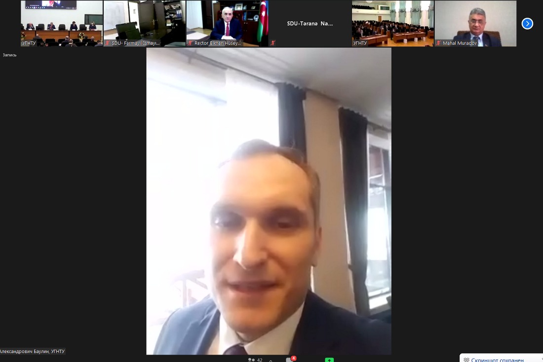 SDU-nun rektoru professor Elxan Hüseynov çıxışını daha nikbin notlarla başa vuraraq qeyd etdi: “Hörmətli həmkarlar, əziz dostlar! Bu gün biz hamımız 2021-ci ilin astanasındayıq. Ümid edirik ki, üzümüzə gələn ildə ölkələrimiz ötən ildəki bəlanın – koronavirus pandemiyasının öhdəsindən uğurla gələcək. Ümid edirik ki, yeni ildə ənənəvi – əyani ünsiyyət və əməkdaşlıq formatına qayıdacağıq. Ümid edirəm ki, hörmətli rektor Oleq Aleksandroviç Baulininin başçılığı altında UDNTU-nun nümayəndə heyəti universitetimizə gələcək və bizim gələcək əməkdaşlıq yollarını müəyyənləşdirmək imkanımız olacaq.