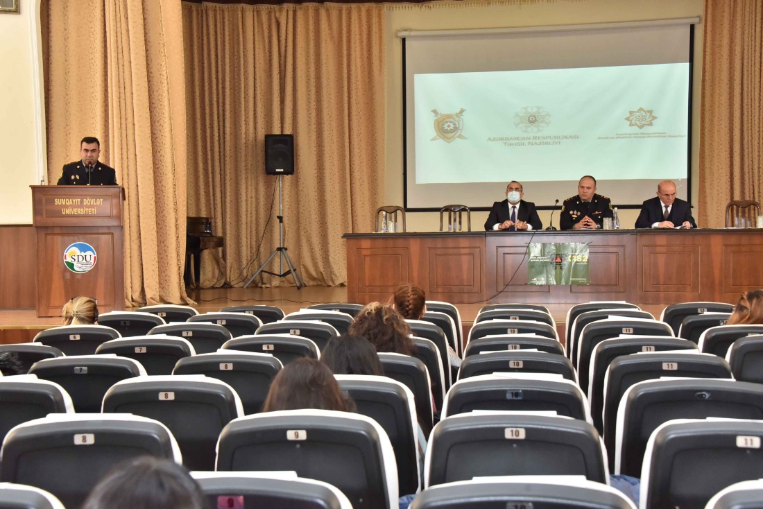 Noyabrın 16-da Sumqayıt Dövlət Universitetində karantin qaydalarına əməl olunmaqla "İnsan alverinə qarşı mübarizə” mövzusunda maarifləndirici tədbir keçirildi.