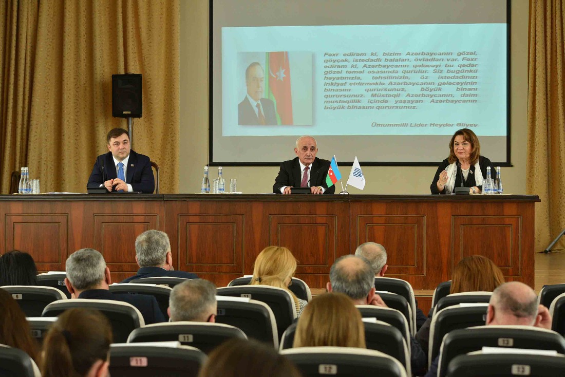 Universitetin rektoru professor Elxan Hüseynov qonaqları, tədbir iştirakçılarını salamladı,onları universitetdə görməkdən məmnunluğunu ifadə etdi və mövzunun aktual məsələlərə həsr olunduğunu diqqətə çatdırdı. Bildirdi ki, cəmiyyət, gənclər siyasəti, ailə və qadın problemlərinin həlli istiqamətində həyata keçirilən tədbirlər mühüm əhəmiyyət kəsb edir,ölkəmizdə hər iki siyasət uğurla davam edir. Rektor xüsusilə vurğuladı ki, Azərbaycan qadını bu gün ölkəmizdə demokratik cəmiyyətin fəal üzvü kimi çıxış edir. Ulu öndər Heydər Əliyev qadınların xidmətlərini - gənc nəslin sağlam, vətənpərvərlik ruhunda böyüməsində sərf etdikləri əməyi hər zaman yüksək qiymətləndirərək, onlara daim böyük diqqət və qayğı göstərmişdir.