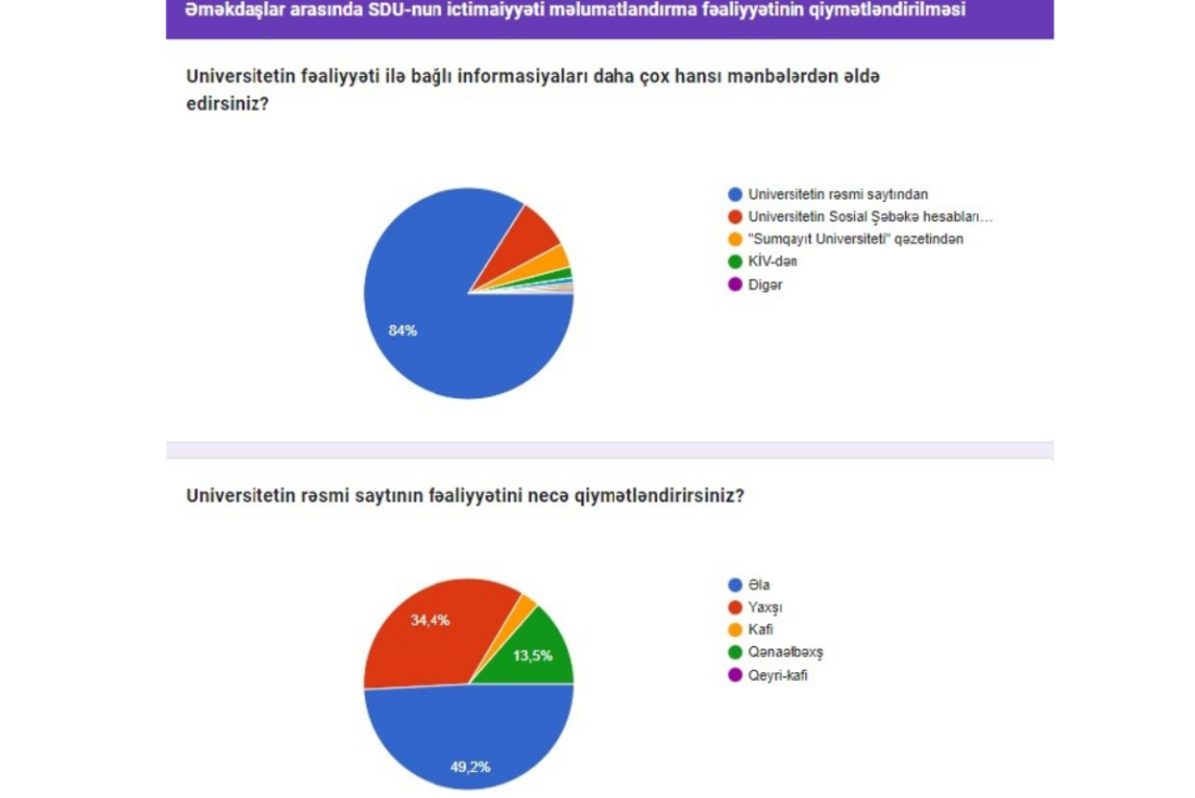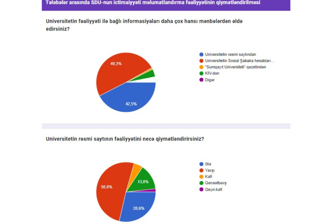 Sumqayıt Dövlət Universitetində dekabr ayının 19-dan 29-dək universitetin əməkdaşları və tələbələri arasında anonim və şəffaf şəkildə Sumqayıt Dövlət Universitetinin ictimaiyyəti məlumatlandırma fəaliyyətinin qiymətləndirilməsi ilə bağlı sorğu keçirilmişdir. Sorğunun keçirilməsində əsas məqsəd SDU-nun ictimaiyyəti məlumatlandırma fəaliyyətinin mütəmadi olaraq izlənilməsi, təhlili və təkmilləşdirilməsindən ibarətdir. Ümumilikdə sorğuda 1700 nəfər iştirak etmişdir. Nəticələrə əsasən universitetin fəaliyyəti ilə bağlı informasiyaları əməkdaşların 84%-i universitetin rəsmi saytından, tələbələrin 49,3%-i isə universitetin sosial şəbəkə hesablarından əldə edirlər. Əməkdaşların 49,2 %-i universitetin rəsmi saytının fəaliyyətini “əla”, tələbələrin isə 50,8%-i “yaxşı” qiymətləndirib. Əməkdaşların 49,2%-i, tələbələrin isə 49,4 %-i  universitetin rəsmi sosial şəbəkə hesablarının fəaliyyətini “yaxşı” qiymətləndiriblər.