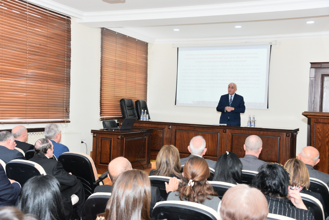 “2019-2023-cü illər üçün Azərbaycan Respublikasında ali təhsil sisteminin beynəlxalq rəqabətliliyinin artırılması üzrə Dövlət Proqramı” çərçivəsində, “Təhsil-tədqiqat-innovasiya” modelinə keçid: qlobal çağırışlar və real imkanlar” devizi altında baş tutan təqdimat SDU-nun rektoru professor Elxan Hüseynovun giriş sözü ilə başladı. Təqdimatda iştirak edən professor-müəllim heyətini salamlayan rektor “2015-2025-ci illər üçün SDU-nun Strateji İnkişaf Planı”na uyğun olaraq, “Azərbaycan 2020: gələcəyə baxış” İnkişaf Konsepsiyası və “Azərbaycan Respublikasında təhsilin inkişafı üzrə Dövlət Strategiyası” ilə müəyyən edilmiş fəaliyyət istiqamətləri nəzərə alınmaqla hazırlanan təqdimatın günün tələbatına cavab verdiyini bildirdi. Dəyişən dünyanın bütün sahələrində olduğu kimi, təhsil sahəsində də yeni strategiya tələbatı barədə danışan professor Elxan Hüseynov təqdimatın Prezident İlham Əliyevin 16 noyabr 2018-ci il tarixli Sərəncamı ilə təsdiq edilən “2019-2023-cü illər üçün Azərbaycan Respublikasında ali təhsil sisteminin beynəlxalq rəqabətliliyinin artırılması üzrə Dövlət Proqramı”nda qarşıya qoyulan tələblər əsasında hazırlandığını diqqətə çatdırdı. Qloballaşma şəraitində yeni iqtisadi çağırışlara uyğun rəqabətqabiliyyətli mütəxəssislərin hazırlanmasının, insan kapitalının davamlı və dayanıqlı inkişafına nail olunmasının qaçılmaz olduğunu qeyd edən rektor dinləniləcək məruzədə və təqdim ediləcək layihədə dünyanın nüfuzlu reytinq cədvəllərinə düşməyin gələcək hədəflərə çatmaq yolunda əsas vasitələrdən biri kimi gördüyünü vurğuladı. Universitetin tədris və elmi laboratoriyaları üçün modern avadanlıq və qurğuların hazırlanmasının, Qərbi Avropa ölkələri, xüsusilə Almaniya zavodları ilə müqavilələrin imzalandığını qeyd edən professor Elxan Hüseynov universitetdə yaradılan Dissertasiya Şuralarının böyük stimullar verdiyini bildirib. SDU-nun yaxın vaxtlarda innovasiya və tədris mərkəzinə çevrilməsinin onun əməkdaşları üçün prioritet istiqamət təşkil etdiyini bildirən rektor ən yaxın hədəflər barədə söhbət açdı.