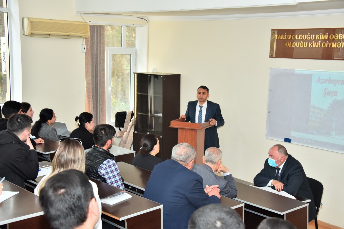 Tarix və onun tədrisi metodikası kafedrasının müdiri dosent Sona Məhərrəmova “Şuşa şəhərinin inkişafında Heydər Əliyevin rolu” mövzusunda çıxış edərək bildirdi ki, Ümummilli Lider Heydər Əliyev Sovet Azərbaycanına rəhbərlik etdiyi dövrdə Şuşa şəhərinin inkişafına xüsusi diqqət ayırmışdı. Məhz Ulu Öndər sayəsində Şuşa şəhərinin tarixi memarlıq abidələri qorunub-saxlanmış, ümumittifaq səviyyəli kurort-sanatoriya şəhərinə çevrilmiş, M.P.Vaqifin məqbərəsi, “Vaqif Poeziya Evi”, şairə Xurşidbanu Natəvanın abidəsinin açılışı olmuş, ermənilərin əsassız iddialarının qarşısı alınmışdır. Ulu Öndər Heydər Əliyev Şuşa haqqında deyirdi: Şuşa Azərbaycanın ən əziz və böyük tarixi olan bir guşəsidir. Şuşanı yaradanlar, Şuşa şəhərini quranlar, Şuşa qalasını tikənlər Azərbaycan torpağının sahibləri olublar və Qarabağda Azərbaycan torpağının daim qorunması, saxlanması üçün Şuşa şəhərini, qalasını yaradıblar. Bu, təkcə Azərbaycan xalqının, əcdadlarımızın yaratdığı böyük şəhər deyil, həm də böyük bir tarixi abidədir.