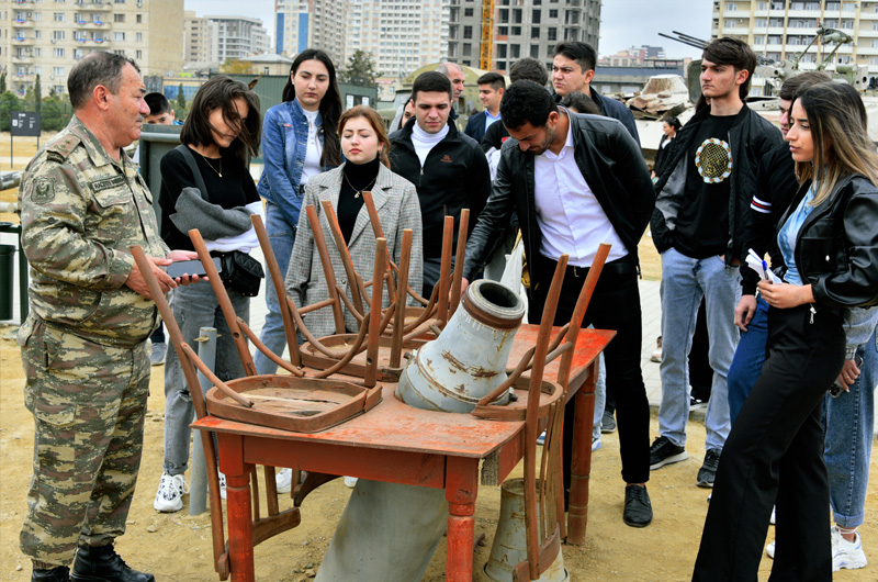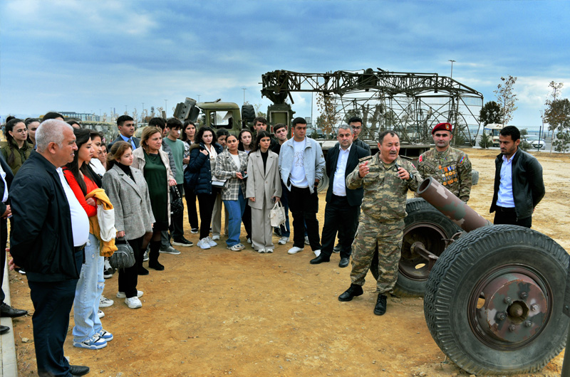 Sumqayıt Dövlət Universitetinin baş müəllimi, polkovnik-leytenant Tapdıq Hacıyevin bələdçiliyi ilə tələbələrimiz parkdakı döyüş sursatları haqqında daha ətraflı məlumat əldə ediblər.
