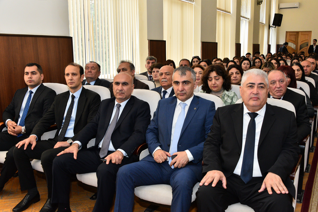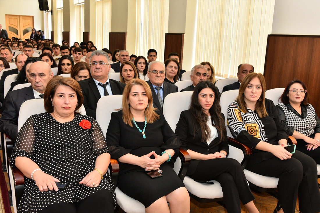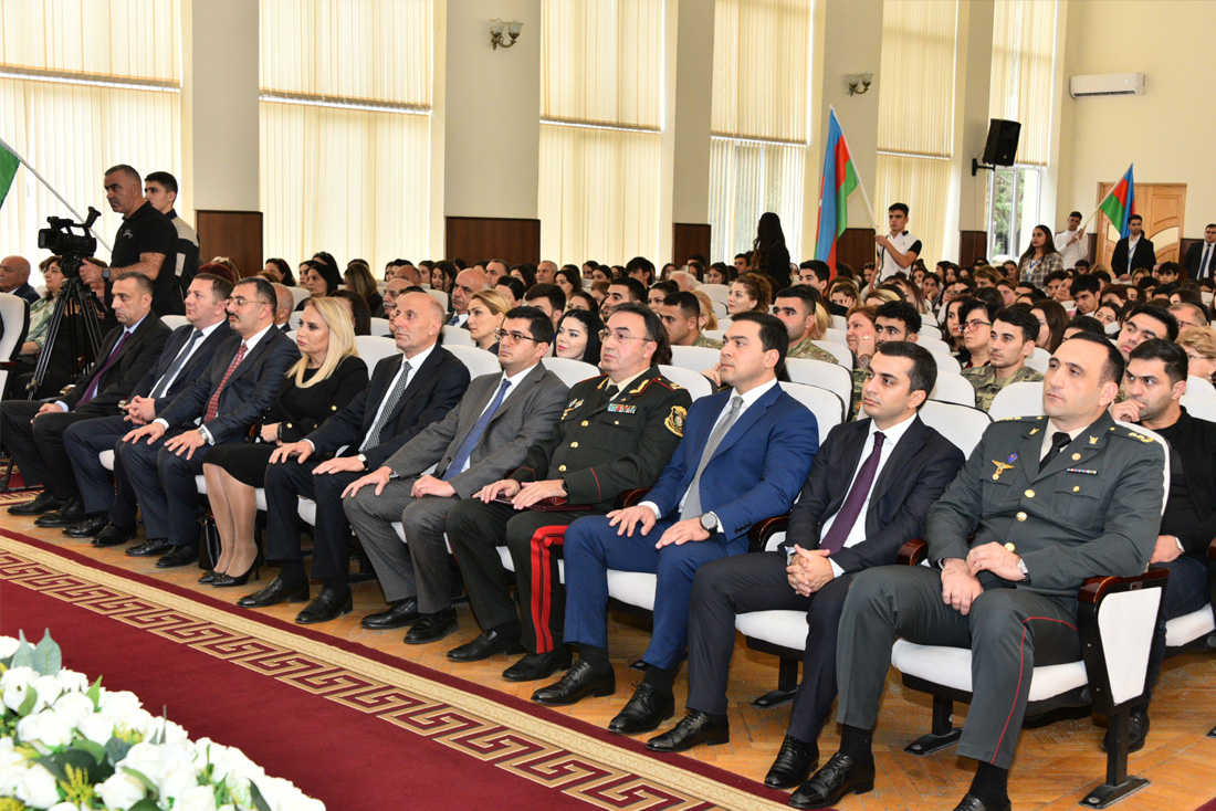 Universitetin rektoru Rüfət Əzizov çıxış edərək Zəfər Günü münasibətilə iştirakçıları təbrik etdi. Bildirdi ki, Ümummilli lider Heydər Əliyevin siyasi xəttini və ideyalarını uğurla davam etdirən Müzəffər Ali Baş Komandan, Prezident İlham Əliyevin qətiyyəti və rəhbərliyi ilə 44 günlük Vətən müharibəsində torpaqlarımızı azad edən şanlı Azərbaycan Ordusu xalqımıza möhtəşəm Zəfər Günü bəxş etdi. Rüfət Əzizov onu da qeyd etdi ki, bu gün böyük qürur və fəxr hissi ilə söyləyirik ki, möhkəm təməlləri xalqımızın xilaskarı, Ulu öndərimiz Heydər Əliyev tərəfindən qoyulan Müstəqil Azərbaycan Respublikası Prezidenti cənab İlham Əliyevin uğurlu siyasəti, müdrik qərarları sayəsində qüdrətli bir dövlətə çevrildi. Müzəffər Ali Baş Komandanımızın qətiyyəti, mahir sərkərdəlik bacarığı, şəhidlərimizin canı, qazilərimizin qanı, xalqımızın ölkə rəhbərinin ətrafında dəmir yumruq kimi birləşməsi sayəsində 2020-ci ilin 27 sentyabrından zəfər salnaməmizin ən şanlı, parlaq səhifələri yazıldı. Zəfər bayramının artıq 3 ili tamam olur. Amma budəfəki Zəfər bayramının əvvəlki iki ildə keçirdiyimizdən böyük fərqi var. Fərqi ondadır ki, tarixi zəfərimizdən 3 il sonra 8 noyabrda Azərbaycan Ordusu Xankəndidə hərbi parad keçirəcək. Bütün bunlar tarixi uğurlardır və onların müəllifi də cənab Prezident İlham Əliyevdir.