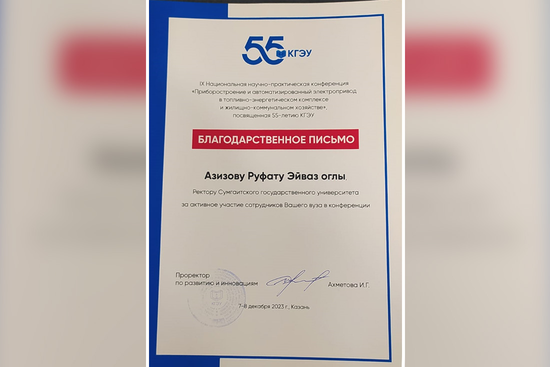 Konfransda yüksək səviyyədə iştiraka görə əməkdaşlarımız sertifikatlarla təltif edilmiş və Kazan Dövlət Energetika Universiteti adından rektor Rüfət Əzizov cənablarına təşəkkürnamə ünvanlanmışdır.