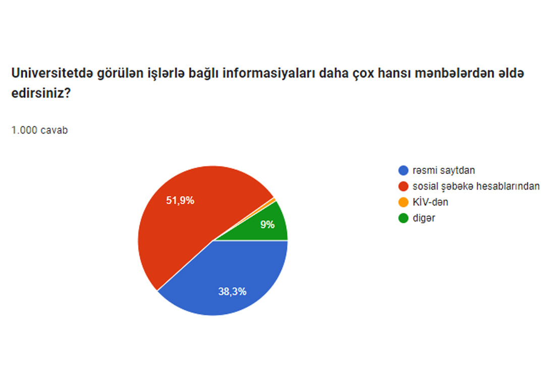 “Universitetdə görülən işlərlə bağlı informasiyaları daha çox hansı mənbələrdən əldə edirsiniz?” sorğusuna əsasən 38,3 % rəsmi saytdan, 51,9 % sosial media hesablarından, 0,8 % KİV-dən, 9 % isə digər vasitələrlə əldə etdiyini qeyd edib.