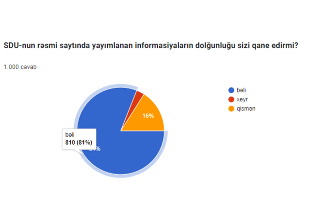 “SDU-nun rəsmi saytında yayımlanan informasiyaların dolğunluğu sizi qane edirmi?” sorğusuna əsasən 81% bəli, 16% qismən, 3% xeyr cavablarını qeyd edib.