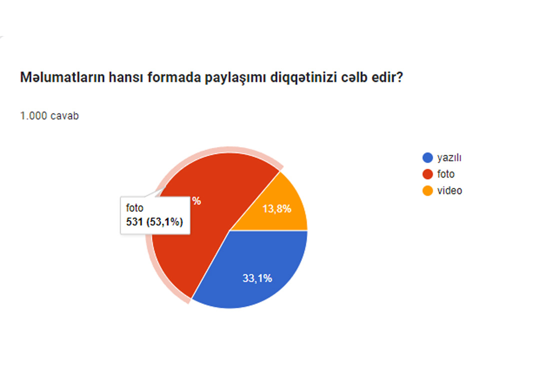 “Məlumatların hansı formada paylaşımı diqqətinizi cəlb edir?” sorğusuna əsasən 53,1 % foto, 33,1% yazılı, 13,8% video şəklində cavablarını qeyd edib.