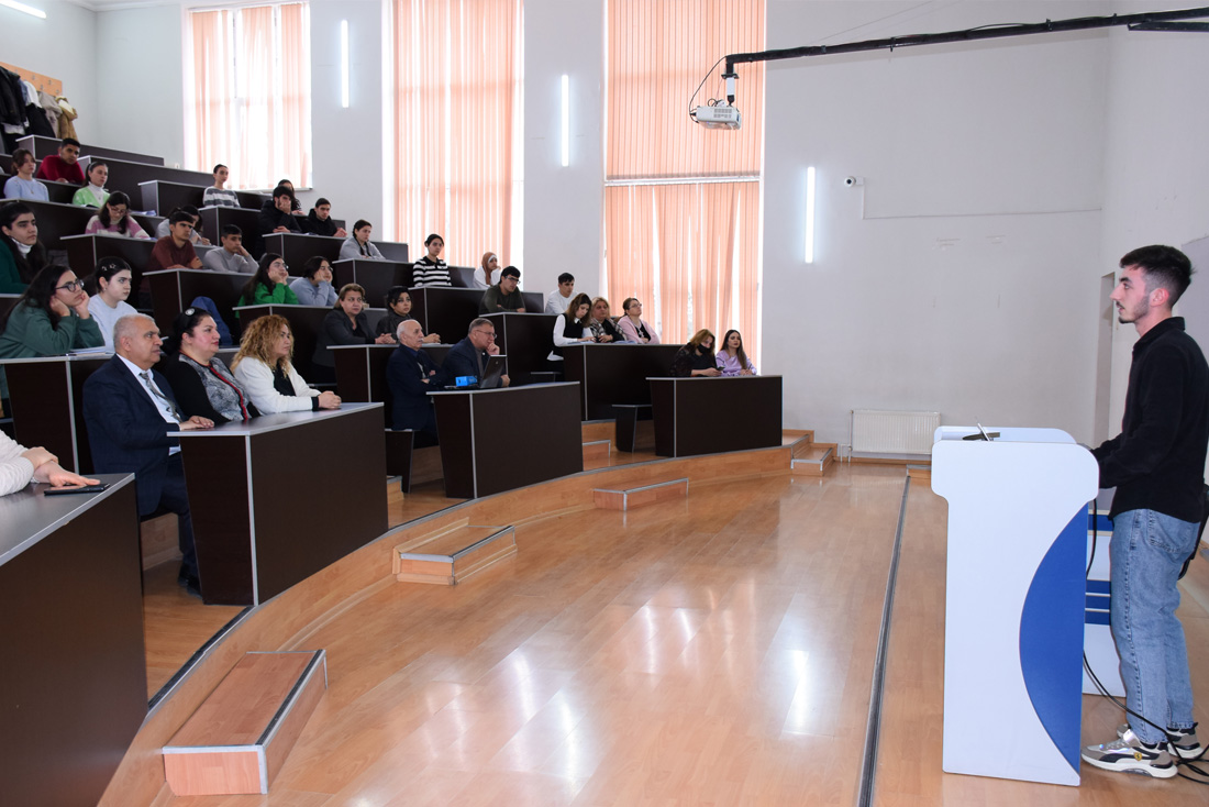 Riyaziyyat fakültəsinin tələbəsi Nicat Babayev müasir İKT avadanlıqlarından istifadə etməklə mövzu ilə bağlı məlumatları təqdimat formasında, praktiki nümunələrə əsaslanan videoçarx vasitəsilə nümayiş etdirdi.
