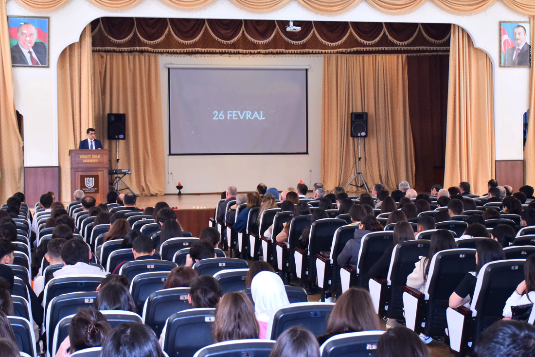 Tədbiri giriş sözü ilə açan rektor dosent Rüfət Əzizov Azərbaycan xalqının tarixinə qara səhifə kimi yazılmış Xocalı faciəsinin dəhşətlərindən bəhs etdi. Qeyd etdi ki, xalqımızın və bəşəriyyətin tarixinə qanlı faciə kimi daxil olmuş Xocalı soyqırımından 32 il keçir.