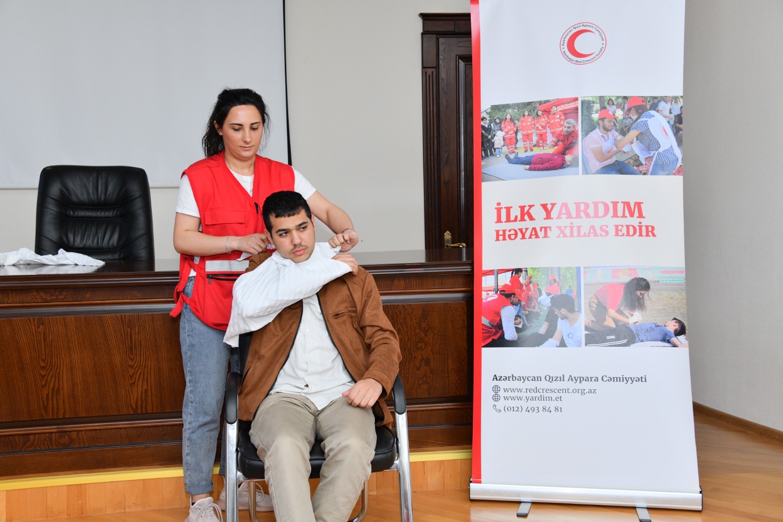Sonra QAC-ın Sumqayıt şəhər bölməsinin əməkdaşları tələbələrə müxtəlif vəziyyətlər zamanı ilk tibbi yardımın göstərilməsi, müxtəlif travmalardan yaranan qanaxmalarda yardımın təşkili, süni tənəffüsün verilməsi və digər proseslər haqqında məlumat verdilər.