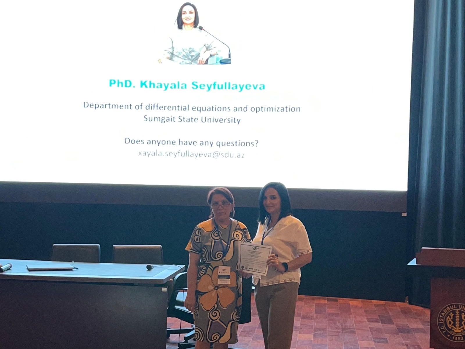 Sumqayıt Dövlət Universitetinin Riyaziyyat fakültəsinin dosenti Xəyalə Seyfullayeva 27-29 avqust 2024-cü il tarixlərində Türkiyənin İstanbul Cerrahpaşa Universitetində “Sənaye, tətbiqli idarəetmə və optimallaşdırma” (The 9th International Conference on Control and Optimization with Industrial Applications) mövzusunda 9-cu beynəlxalq elmi konfransda (COIA-2024) təqdimatla çıxış edib.
