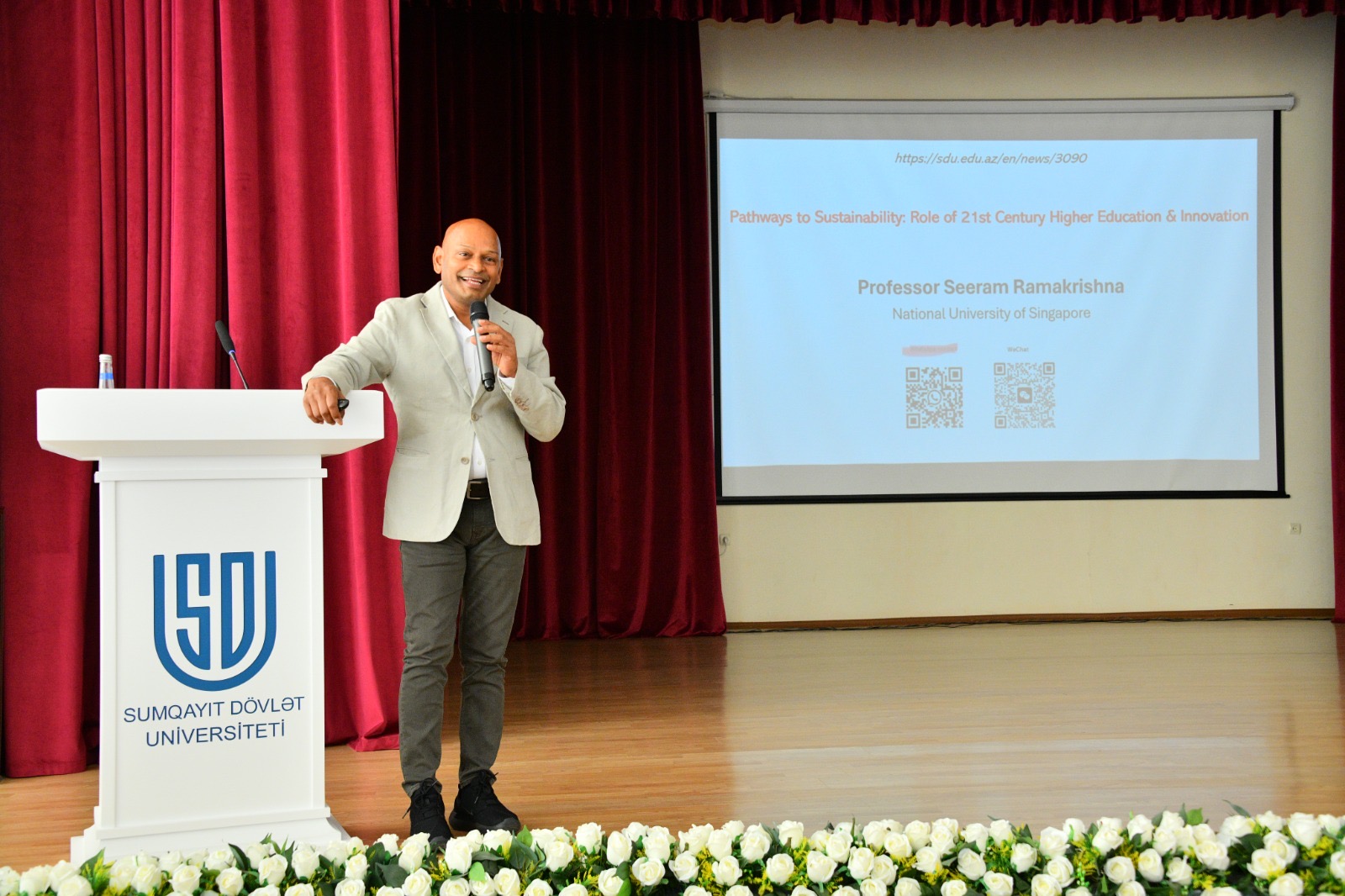 Sentyabrın 11-də QS Dünya Universitetlərinin Reytinqinə görə dünyanın ən yaxşı 8 universiteti arasında yer alan Sinqapur Milli Universitetinin (SMU) Dayanıqlılıq və Nanotexnologiya Mərkəzinin direktoru, professor Siram Ramakrişna Sumqayıt Dövlət Universitetində (SDU) “Dayanıqlı inkişafa doğru: XXI əsrdə ali təhsilin və innovasiyaların rolu” adlı açıq mühazirə ilə çıxış edib.