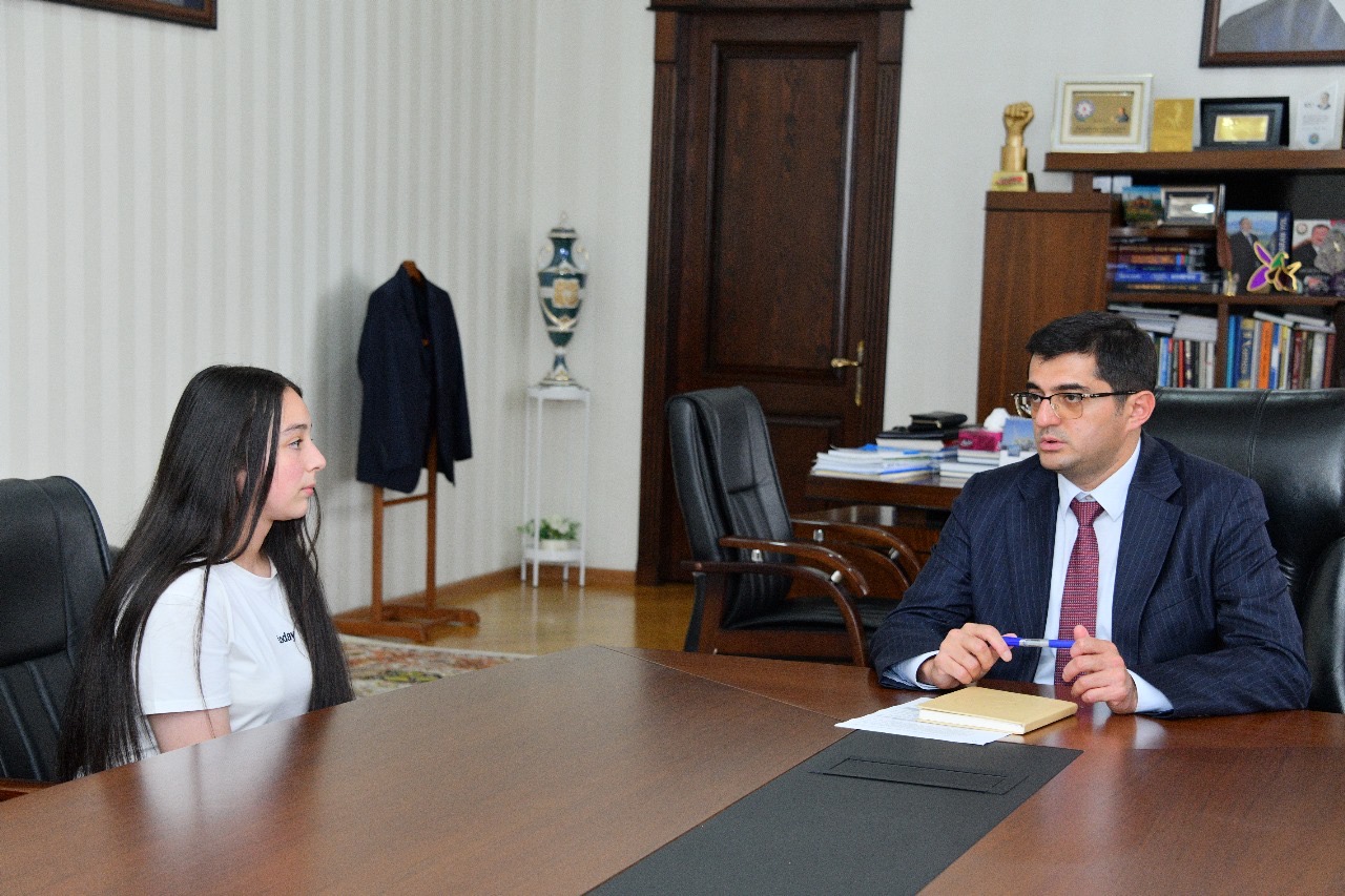 Sentyabrın 20-də Sumqayıt Dövlət Universitetinin rektoru dosent Rüfət Əzizov 2024-2025-ci tədris ilində Universitetə 633.2 balla Riyaziyyat və informatika müəllimliyi ixtisasına qəbul olan birinci kurs tələbəsi Səmədzadə Zərifə İlqar qızı ilə görüşüb.