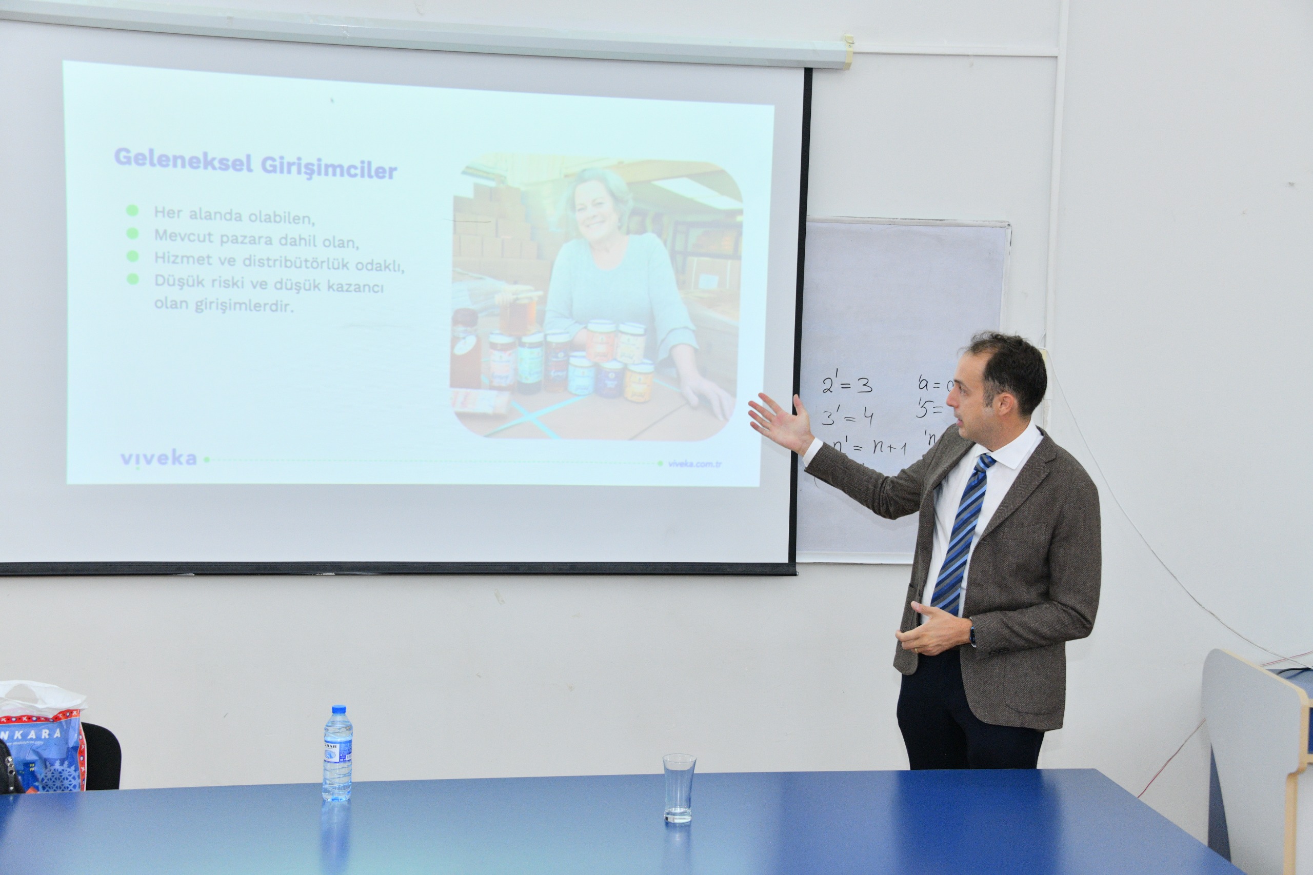 İlk modulda “Sahibkarlığa Giriş və İdeyaların Yaradılması” mövzusu ilə “Viveka” strateji innovasiya məsləhətçiliyi şirkətinin təsisçi və Təlim Koordinatoru Emin Okutan çıxış edib.