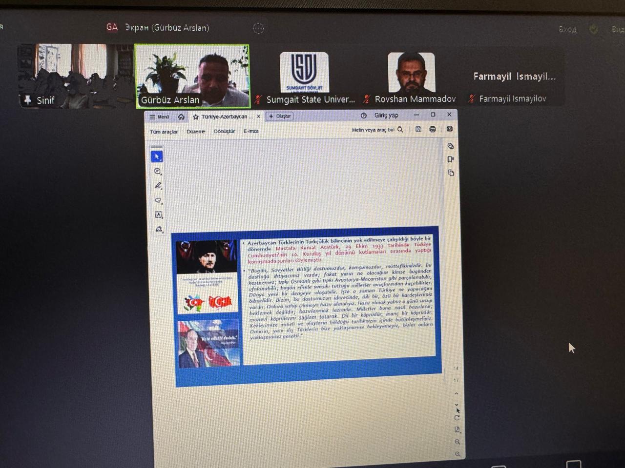 31 oktyabr tarixində Sumqayıt Dövlət Universitetinin Tarix və coğrafiya fakültəsinin Azərbaycan və Şərqi Avropa xalqları tarixi kafedrasının təşkilatçılığı ilə Türkiyə Cümhuriyyətinin 101-ci ildönümünə həsr olunmuş xüsusi mühazirə təşkil edildi. Mühazirə Zonguldak Bülent Ecevit Universitetinin İnsan və Toplum Elmləri fakültəsinin Tarix Bölümünün Sosial Elmlər İnstitutunun müdir müavini dosent dr. Gürbüz Arslan tərəfindən “İki Dövlət, Tək Millət: Türkiyə-Azərbaycan” mövzusunda onlayn formatda keçirildi. Azərbaycan və Şərqi Avropa xalqları tarixi kafedrasının İllik Fəaliyyət Planı çərçivəsində baş tutan tədbirdə kafedra müdiri professor Şirxan Səlimov, kafedranın əməkdaşları: professor Hacı Həsənov, tarix üzrə fəlsəfə doktoru, baş müəllim Xuraman Vəliyeva və fakültənin tələbələri iştirak etdilər. Mühazirə iştirakçıları Azərbaycanın və Türkiyənin tarixi əlaqələri, qardaşlıq münasibətləri və iki ölkə arasındakı əməkdaşlıq mövzularında dəyərli məlumatlar əldə etdilər.Tələbələri maraqlandıran suallar mühazirədən sonra qarşılıqlı müzakirələr çərçivəsində cavablandırıldı və dosent dr. Arslan Gürbüz tələbələrə dərin izahatlar təqdim etdi. Mühazirə həm akademik, həm də dostluq əlaqələrinin gücləndirilməsi baxımından yüksək qiymətləndirildi.