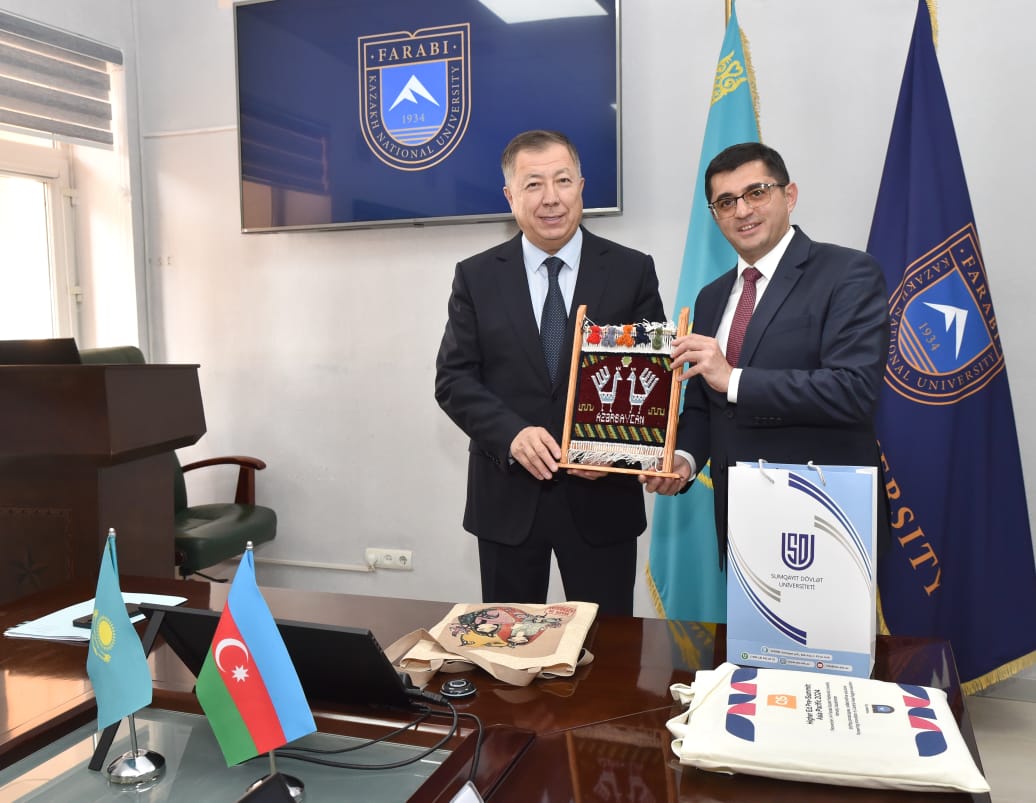 Noyabrın 2-si Sumqayıt Dövlət Universitetinin (SDU) nümayəndə heyəti Əl-Fərabi adına Qazax Milli Universitetini ziyarət edib. Görüşdə iki universitet arasında elmi tədqiqat, birgə məzmun hazırlığı və müəllim-tələbə mobilliyi layihələri müzakirə olunub. Ziyarət çərçivəsində Qazax Milli Universitetinin innovasiya mərkəzi, muzeyi və laboratoriyaları ilə tanış olunub. Görüşdə davamlı əməkdaşlıq istiqamətlərinin müəyyənləşdirilməsi üçün dekan, kafedra müdirləri və struktur bölmələri işçi qaydada görüşlər keçirib.