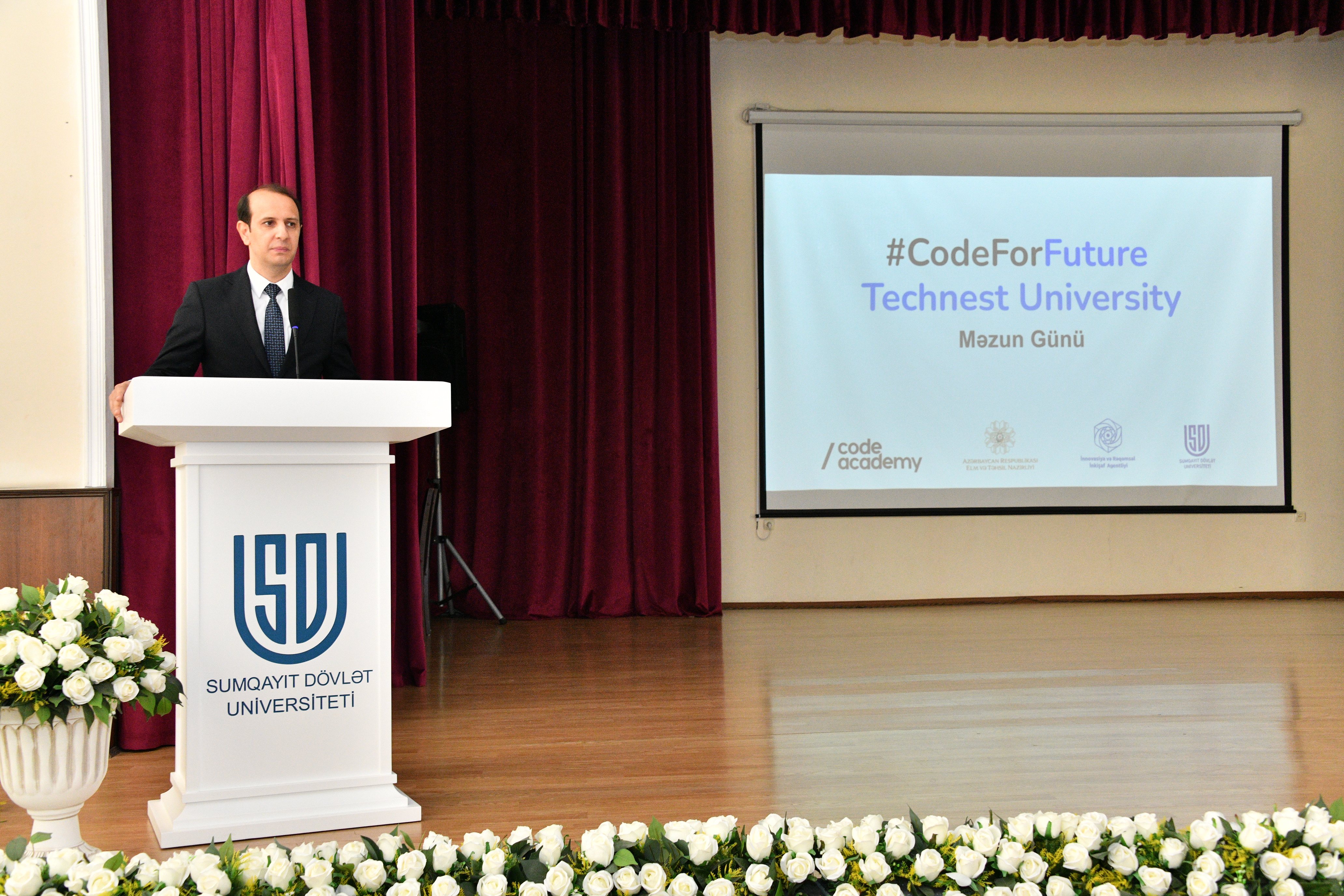 Oktyabrın 28-də Elm və Təhsil Nazirliyi, İnnovasiya və Rəqəmsal İnkişaf Agentliyinin birgə təşkilatçılığı, “Code Academy” nin tərəfdaşlığı ilə "Code For Future" layihəsi çərçivəsində Sumqayıt Dövlət Univesitetinin (SDU) tələbələri üçün məzun günü keçirilib. Məzun gününü giriş sözü ilə layihənin baş koordinatoru Asiya Rüstəmova açaraq “Code for Future" layihəsinin tələbələr üçün əhəmiyyətini vurğulayıb. Təqdimatla çıxış edən baş koordinator layihə çərçivəsində ötən semestrin nəticələri və növbəti semester üçün nəzərdə tutulan işlər barədə məlumat verib, həmçinin payız – yaz semestri ərzində İnformasiya Texnologiyaları və Proqramlaşdırma üzrə təhsilini başa vurmuş məzunları təbrik edib. Tədbirdə Elm və Ali Təhsil üzrə Dövlət Agentliyində Qiymətləndirmə və Monitorinq Departamentinin baş analitiki Namiq Nəsibov çıxış edərək İT sahəsi üzrə gənclərin biliklərinin artırılması, bacarıqlarının inkişaf etdirilməsi və gələcək karyeralarında bu kimi layihələrin önəmini qeyd edib. SDU-nun Elm və innovasiyalar üzrə prorektoru dosent Elşad Abdullayev bu münasibətlə məzunları ürəkdən təbrik edib, əmək bazarında peşəkar kadrlara hər zaman böyük ehtiyacın olduğunu qeyd edərək “Code Academy”dən faydalanmağı tövsiyə edib. Sonra “Code For Future" layihəsinin müəllimləri Rəmzi Məmmədli və Fidan Məmmədova çıxış edərək layihəni uğurla tamamlandıqlarına görə bir daha məzunları təbrik edib və onlar ilə qürur duyduqlarını diqqətə çatdırıblar. Sonda layihənin məzunu olan SDU tələbələrinə diplom və sertifikatlar təqdim edilib.