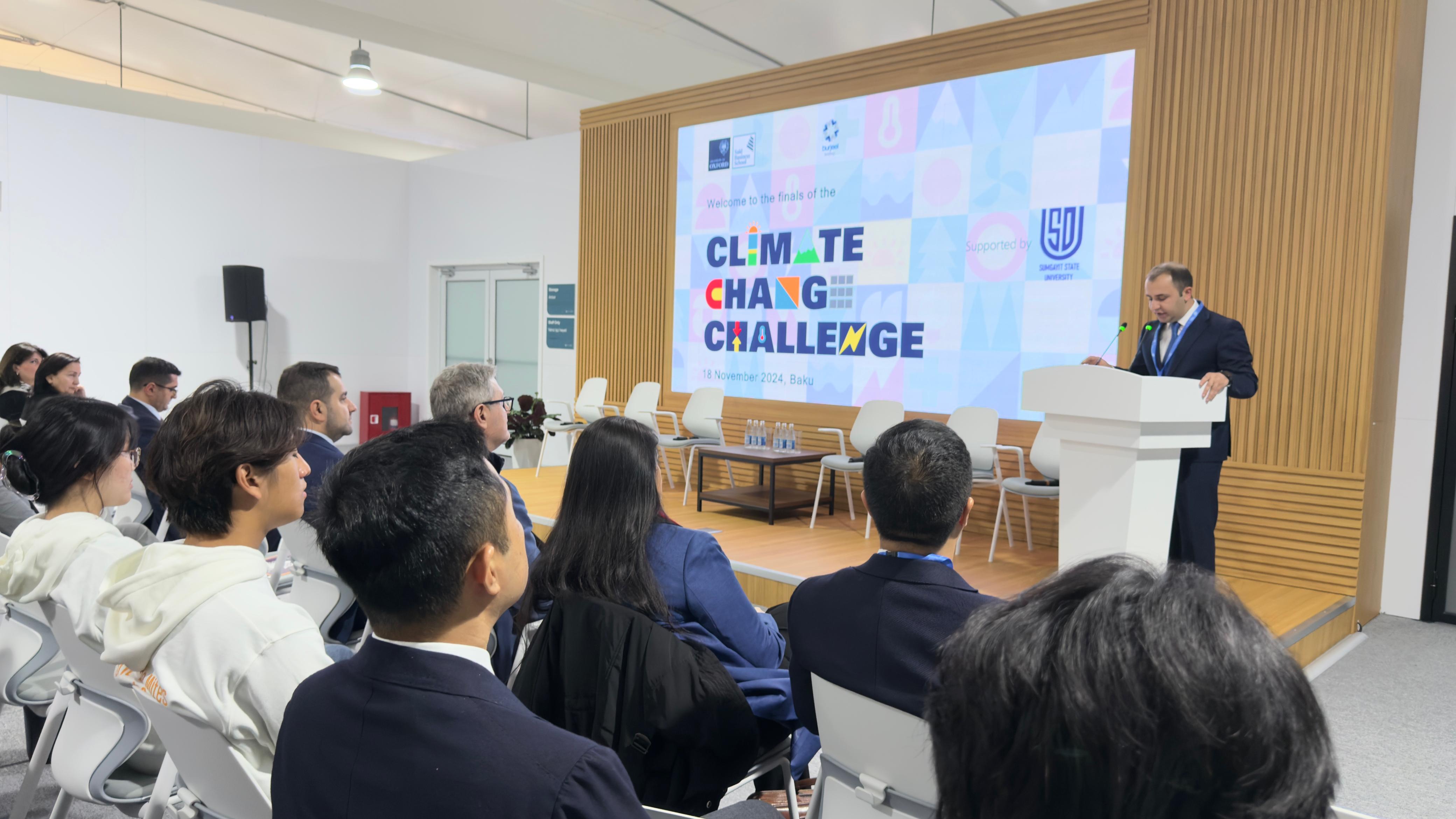 18 noyabr 2024-cü il tarixində Sumqayıt Dövlət Universitetinin dəstəyi lə Oksford Universiteti (Saïd Business School) və Burjeel Holdinq COP29 çərçivəsində “İqlim Dəyişikliyi Müsabiqəsi” final mərhələsi keçirilib. Sumqayıt Dövlət Universitetinin dəstəyi ilə həyata keçirilən müsabiqəyə 58 ölkədən daxil olan 1000-dən çox müraciət daxil olub ki, bunlardan təxminən 135-i Azərbaycandan olub. Ümumilikdə, 5 müəllim və 5 şagird komandası final mərhələsində iştirak hüququ qazanıb. Finala vəsiqə qazanan müəllimlərdən Azərbaycandan Aliyə Əhmədova, Hindistandan Mariya Shah və Naqeeb Mehdi, Böyük Britaniyadan Michael P. Jones və Livandan Roudaina Kassam, şagird komandalarından isə ABŞ-dən 2, Böyük Britaniya, Birləşmiş Ərəb Əmirliyindən və Livandan bir komanda layihələrini münsiflər heyətinə təqdim edib. Azərbaycan Respublikası elm və təhsil nazirinin müavini Kənan Kərimzadə müsabiqənin açılışında çıxış edərək layihənin vacibliyindən danışıb və müsabiqə finalçılarına uğurlar arzu edib. Sumqayıt Dövlət Universitetinin rektoru, dosent Rüfət Əzizov və Oksford Universitetinin (Saïd Business School) əməliyyatlar üzrə baş direktoru Manos Kapterian çıxış edərək müsabiqə haqqında məlumat verib. Təqdimatlardan sonra münsiflər heyəti layihələrin qiymətləndirməsini aparıb. Müsabiqənin münsiflər heyətinin qərarı ilə finala vəsiqə qazanan müəllimlərdən Hindistanı təmsil edən Naqeeb Mehdi, şagird komandalarından isə Birləşmiş Ərəb Əmirliyi təmsil edən komanda birinci yerə layiq görülüb. Mükafatlandırma mərasimində elm və təhsil nazirinin müavini Həsən Həsənli çıxış edərək müsabiqənin faydalarından bəhs edib və qalibləri təbrik edib. Qeyd edək ki, hər il keçirilən “İqlim Dəyişikliyi Müsabiqəsi” qlobal arenada gəncləri iqlim dəyişikliyinə qarşı hərəkətə keçməyə və öz cəmiyyətlərində transformativ dəyişikliklər yaratmağa ruhlandırmaq üçün geniş səylərin bir hissəsidir.