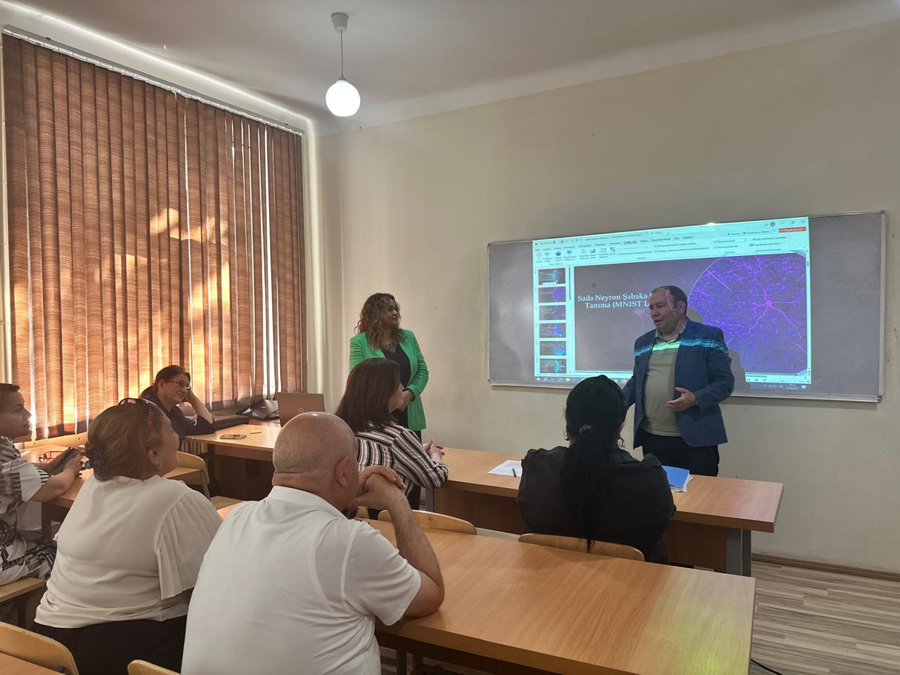 Sonra Riyaziyyat və informatikanın tədrisi texnologiyası kafedrasının dosenti, texnika elmləri doktoru Şəhla Hüseynzadə “Neyron şəbəkələr və onların maşın öyrətməsində rolu”, baş müəllim Səbinə Qurbanova “Neyron şəbəkə əsaslı süni intellekt modellərini hazırlamağa imkan verən vizual və interaktiv platformada iş”, müəllim Könül Əliyeva isə “Neyron şəbəkə əsaslı praktik tətbiqlər: obraz tanıma və qərar qəbul etmə”, mövzularında məruzələrlə çıxış ediblər. Məruzəçilər çıxışlarında neyron şəbəkələrin nəzəri əsasları, real həyat tətbiqləri və bu sahədə istifadə olunan müasir texnologiyalar barədə məlumat verib, süni intellektin inkişafında bu alətlərin əhəmiyyətini vurğulayıblar.