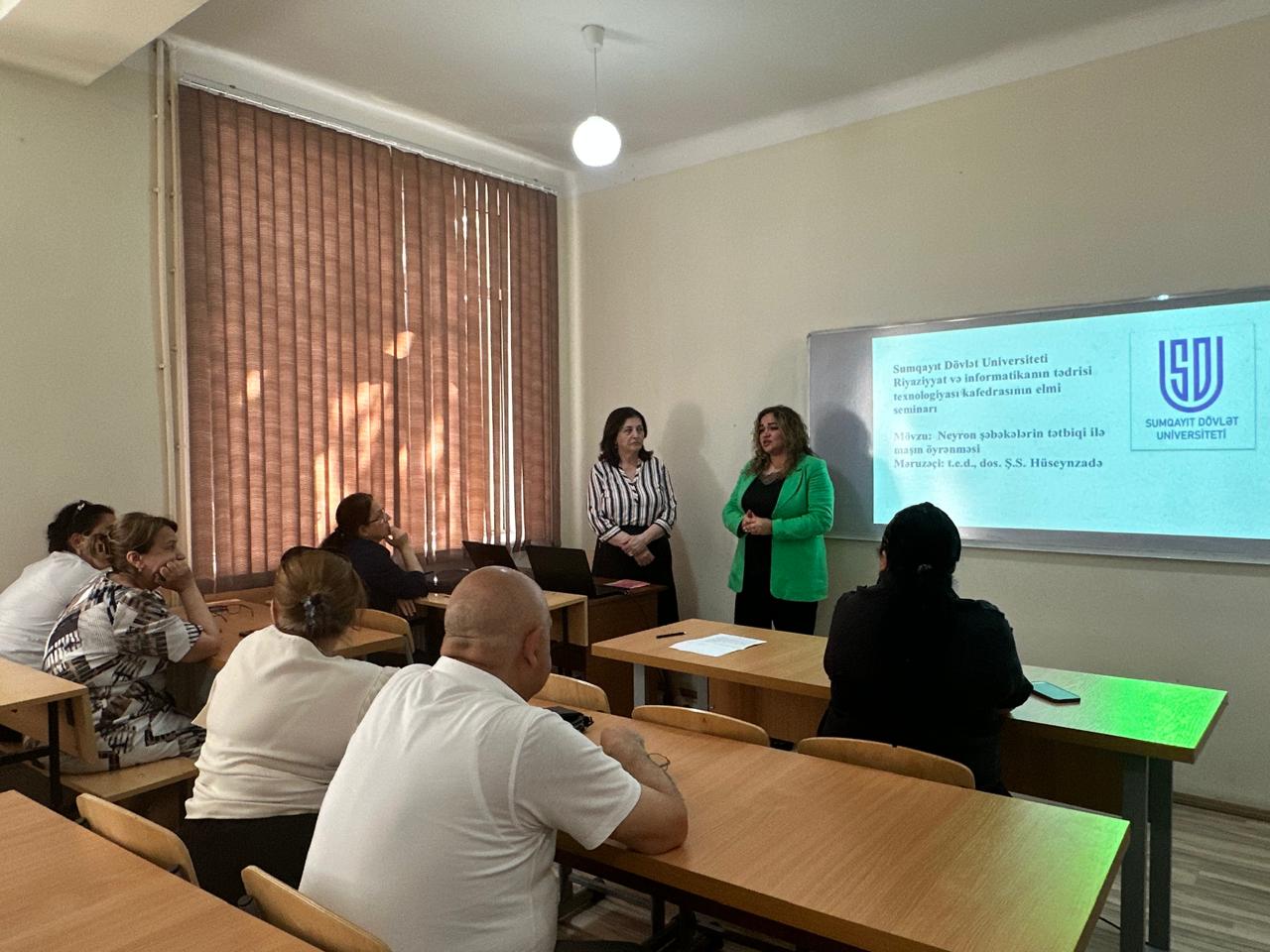 Mayın 29-da Riyaziyyat və informatikanın tədrisi texnologiyası kafedrasının təşkilatçılığı ilə “Neyron şəbəkələrin tətbiqi ilə maşın öyrətməsi” mövzusunda elmi seminar keçirilib. Seminarı kafedranın müdiri, dosent Məftun Heydərova açaraq tədbirin əhəmiyyətindən bəhs edib, seminarın keçirilməsində əsas məqsədin süni intellekt və maşın öyrənməsi sahəsində neyron şəbəkələrin nəzəri və praktiki potensialının dəyərləndirilməsi, həmçinin bu texnologiyaların elmi-tədqiqat və tədris mühitində tətbiq imkanlarının araşdırılması olduğunu vurğulayıb.