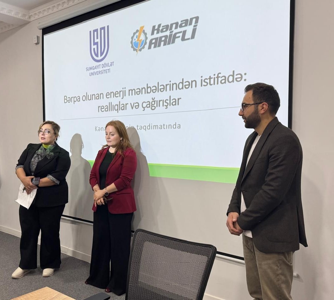 Aprelin 24-də Sumqayıt Dövlət Universitetinin (SDU) Mühəndislik fakültəsi Energetika kafedrasının təşəbbüsü və Karyera və Məzunlarla İş Mərkəzinin təşkilatçılığı ilə "Bərpa olunan enerji mənbələrindən istifadə: reallıqlar və çağırışlar" mövzusu üzrə təlim keçirilib.