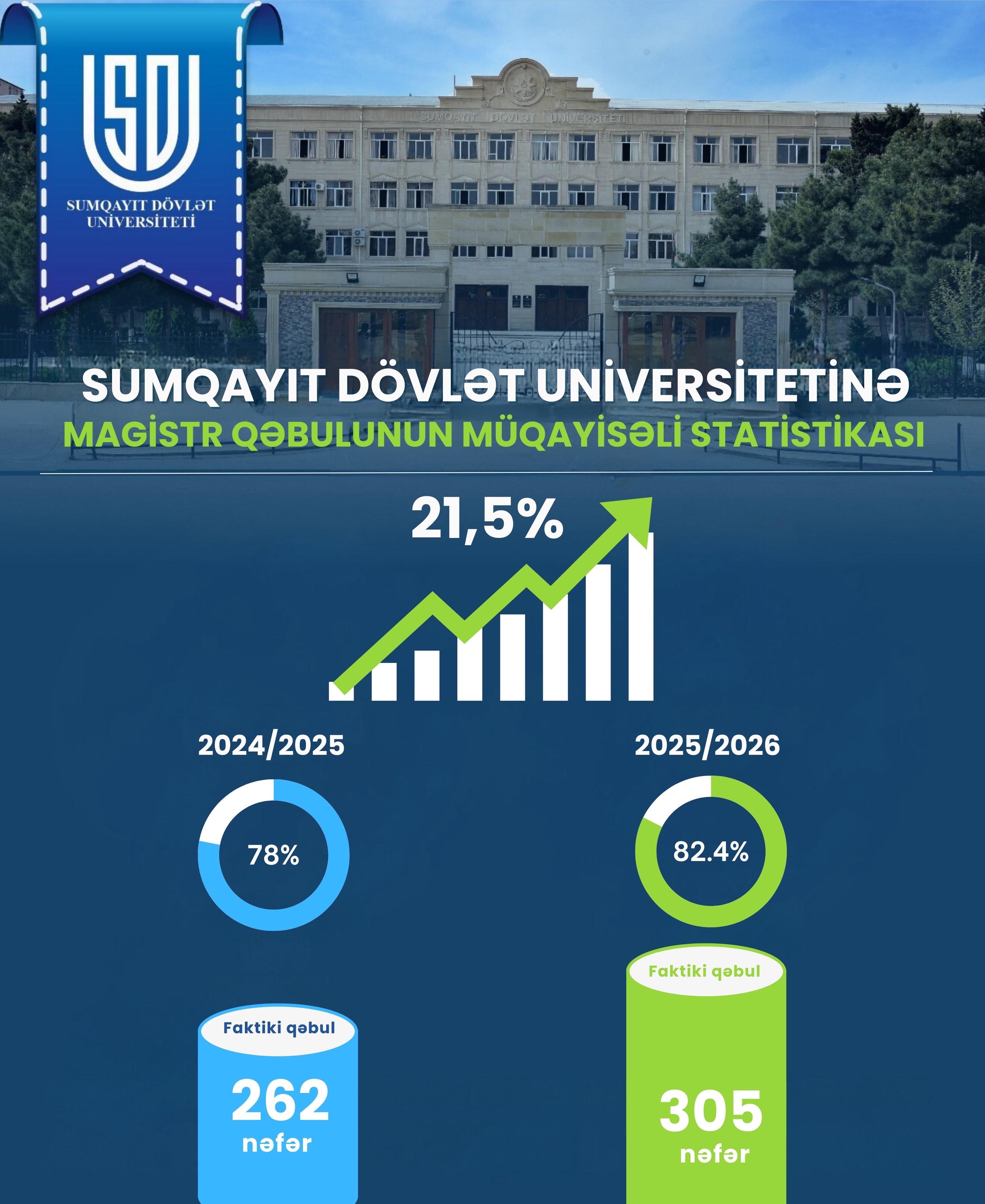 Qeyd edək ki, Sumqayıt Dövlət Universitetində magistratura səviyyəsində qəbul olunanların sayı da ötən illə müqayisədə 21,5% artıb. Əgər ötən tədris ilində qəbul olunan magistrantların sayı 251 nəfər idisə, bu il 305 nəfər olmuşdur.