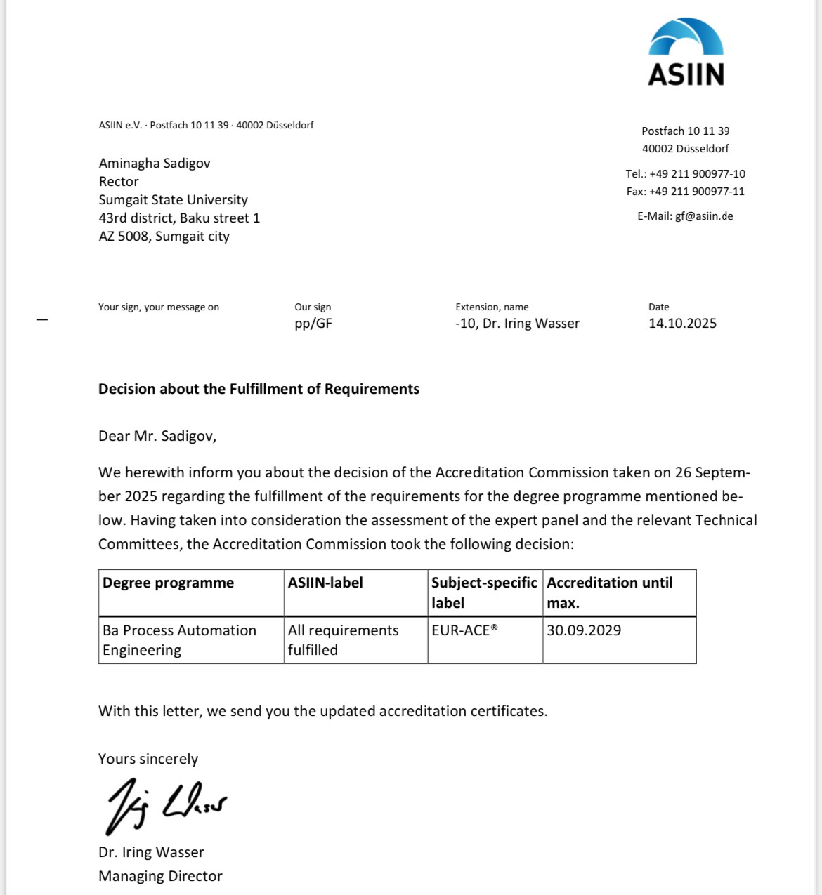 Sumqayıt Dövlət Universitetinin(SDU) “Proseslərin avtomatlaşdırılması mühəndisliyi” ixtisası beynəlxalq akkreditasiyadan uğurla keçərək mühüm nailiyyət əldə edib. Almaniyanın Düsseldorf şəhərində yerləşən nüfuzlu ASİİN beynəlxalq akkreditasiya agentliyi ilə Sumqayıt Dövlət Universiteti arasında imzalanmış 17 oktyabr 2022-ci il tarixli müqaviləyə əsasən, bakalavriat səviyyəsində tədris olunan “Proseslərin avtomatlaşdırılması mühəndisliyi” ixtisasının təhsil proqramının beynəlxalq akkreditasiyadan keçirilməsi prosesi həyata keçirilib. Bu məqsədlə ASİİN-in tələblərinə uyğun olaraq universitet tərəfindən geniş hesabatlar və müvafiq məlumatlar təqdim edilib. 2024-cü ilin 10–12 oktyabr tarixlərində agentliyin ekspert qrupu universitetdə qiymətləndirmə səfərində olub. Qrupun tərkibinə Chemnitz Universitetinin professoru sədr Madhukar Candra , Hamburq Tətbiqi Elmlər Universitetinin professoru Volfqanq Renz, Bosch şirkətindən Dr. Alfred Şulte, ADA Universitetinin tələbəsi İlhamə Novruzova və layihə koordinatoru Paulina Petracenko daxil idi. Ekspertlər universitetin Mühəndislik fakültəsinin laboratoriyalarına və auditoriyalarına baxış keçiriblər. Görüşlər zamanı tədris mühitinin müasir standartlara uyğunluğu, müəllimlərin peşəkar inkişafı, imtahan prosesləri, elmi-tədqiqat fəaliyyəti, tələbə mobilliyi və keyfiyyət təminatı mexanizmləri müzakirə olunub. Eyni zamanda, sənaye tərəfdaşları ilə görüşlər keçirilib, universitetin infrastruktur imkanları qiymətləndirilib. Aparılmış qiymətləndirmənin nəticəsinə əsasən, ASİİN akkreditasiya komissiyasının 14 oktyabr 2025-ci il tarixli qərarı ilə Sumqayıt Dövlət Universitetinin “Proseslərin avtomatlaşdırılması mühəndisliyi” ixtisası üzrə təhsil proqramı 2024–2029-cu illər üçün 5 il müddətinə beynəlxalq akkreditasiyadan müvəffəqiyyətlə keçmişdir.