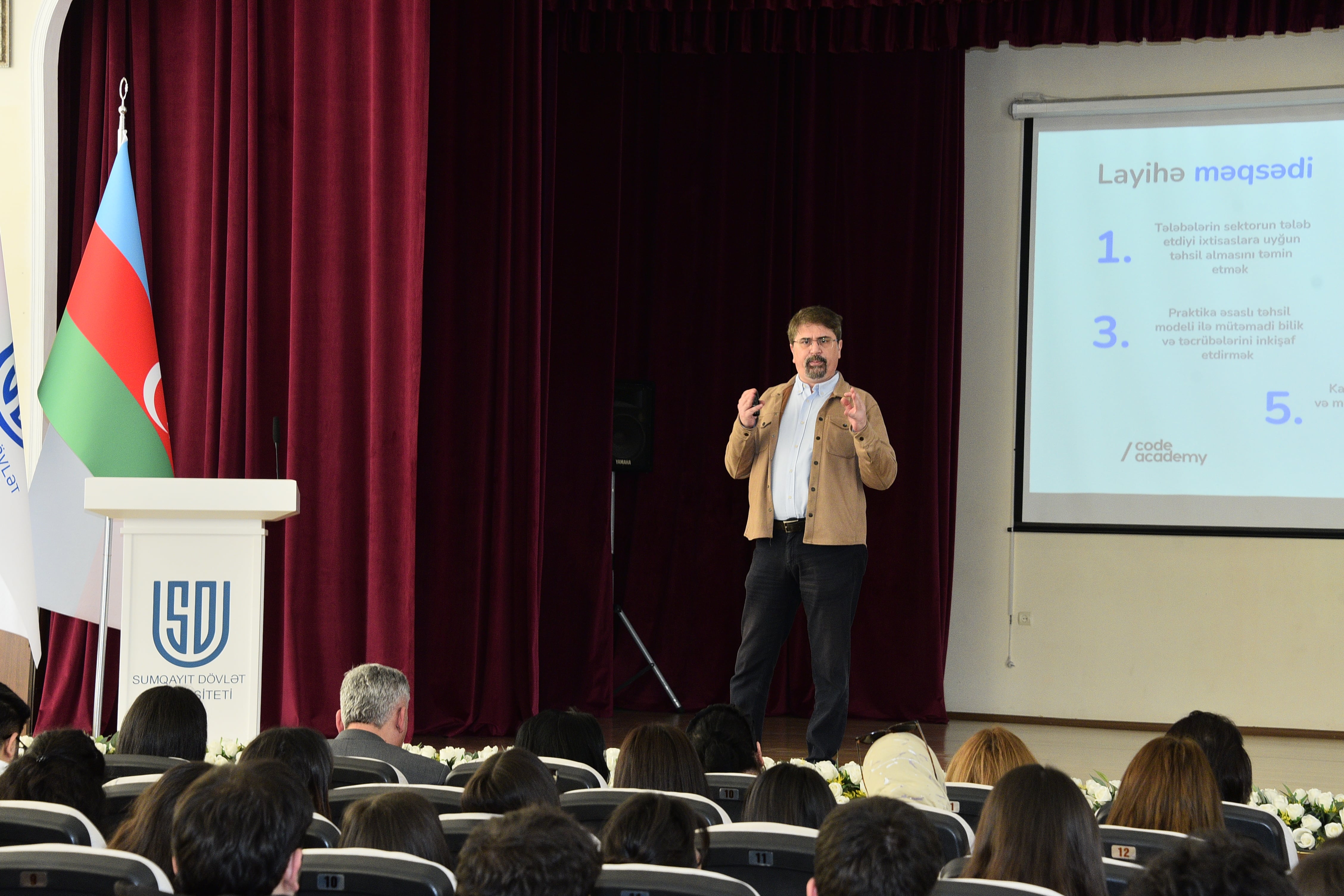 Dekabrın 1-də Sumqayıt Dövlət Universitetinin Böyük Akt zalında Beynəlxalq əməkdaşlıq və strateji layihələr şöbəsinin təşkilatçılığı və Elm və Təhsil Nazirliyinin dəstəyi ilə Code Academy tərəfindən həyata keçirilən “Code for Future” layihəsinin 2025–2026-cı tədris ilinin yaz semestri üçün infosessiya təşkil olunub. Tədbirdə “Code Academy”nin biznesin inkişafı üzrə baş direktoru və layihənin rəhbəri Tuğrul Kapucuoğlu çıxış edərək informasiya texnologiyaları (İT) sahəsindəki 30 illik təcrübəsini və son 4 ildə layihə çərçivəsində görülən işləri iştirakçılarla bölüşüb. O, informasiya texnologiyalarının sürətlə inkişaf etdiyini, süni intellektin tətbiq sahələrinin genişləndiyini və İT-nin bütün sahələrə təsirini diqqətə çatdırıb. Tuğrul Kapucuoğlu layihənin əhəmiyyətini vurğulayaraq tərəfdaşlıq imkanlarından danışıb və qeyd edib ki, universitetlər tələbələrə nəzəri bilik verir, layihə isə onları praktiki sahədə formalaşdırır. Həmçinin layihə çərçivəsində beynəlxalq dərəcəli sertifikatların təqdim olunduğunu da bildirib. O, növbəti semestr üçün qeydiyyat proseslərinin başladığını diqqətə çatdıraraq, iştirakçılara layihə çərçivəsində təqdim olunan imkanlar barədə ətraflı məlumat verib. Qeyd edib ki, ödənişsiz tədris proqramları və praktiki məşğələlər tələbələrin əmək bazarının tələblərinə uyğun inkişafına şərait yaradır və onların gələcəkdə rəqabətqabiliyyətli, yüksək ixtisaslı İT mütəxəssisləri kimi yetişməsinə şərait yaradır.
