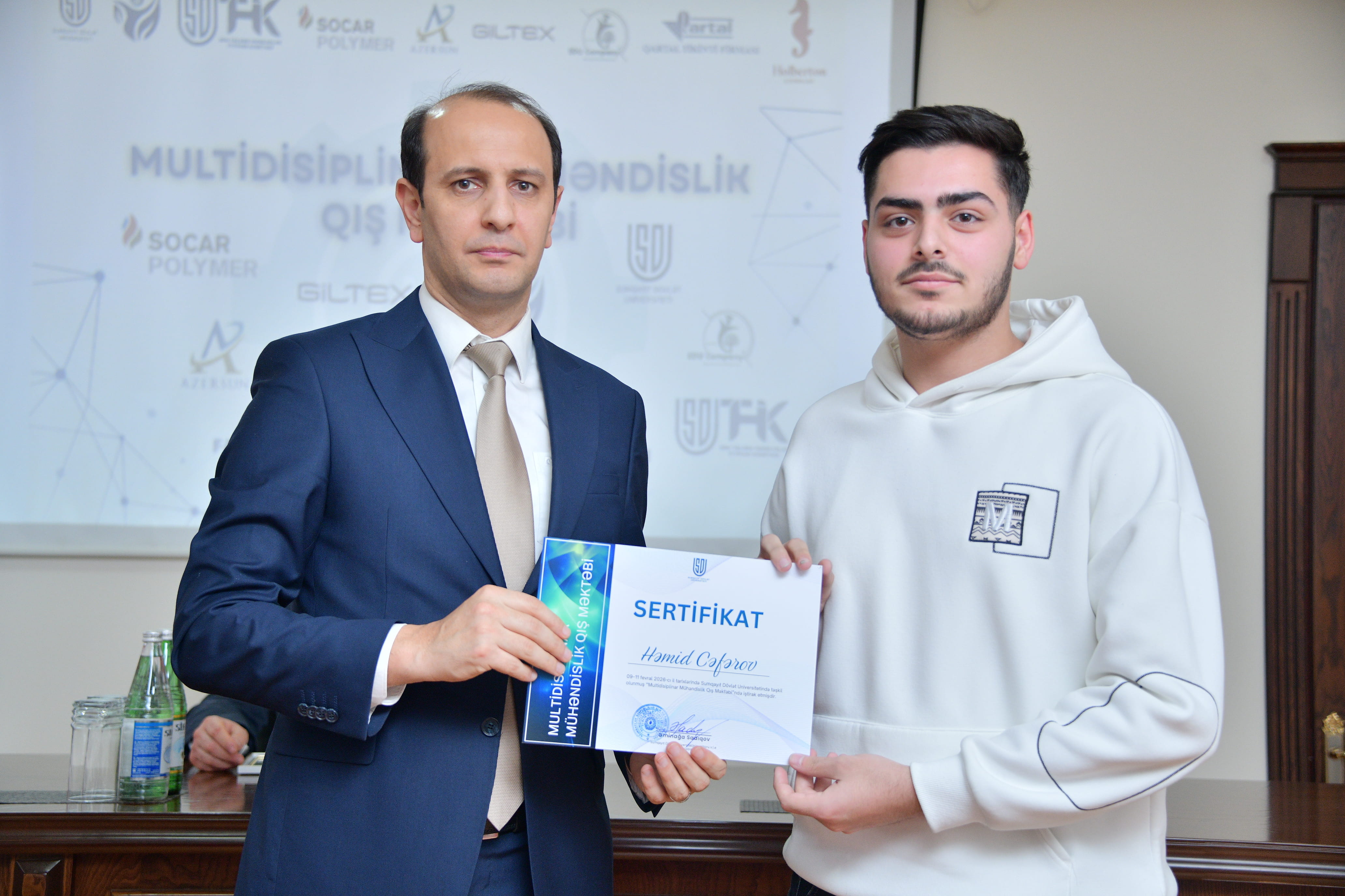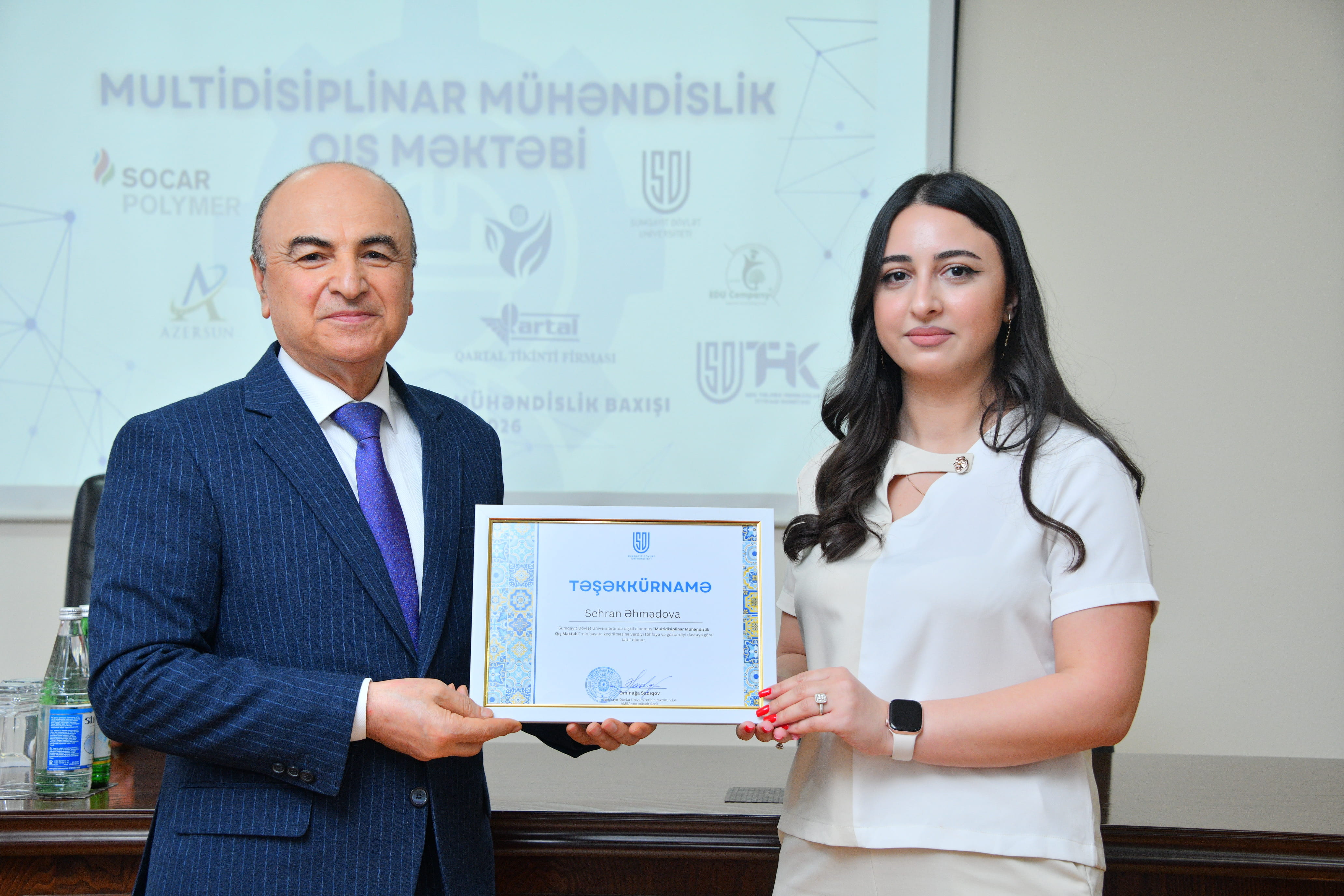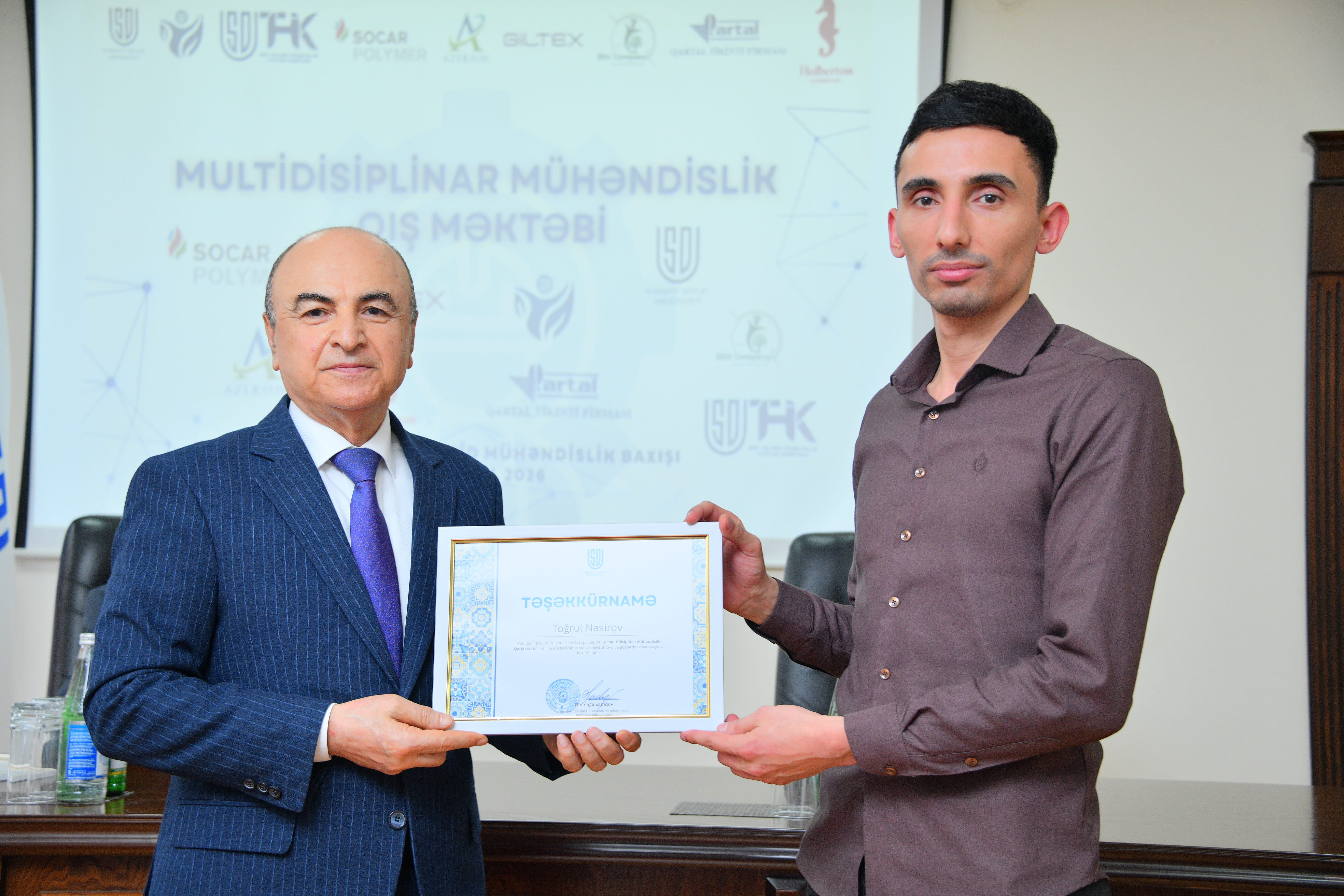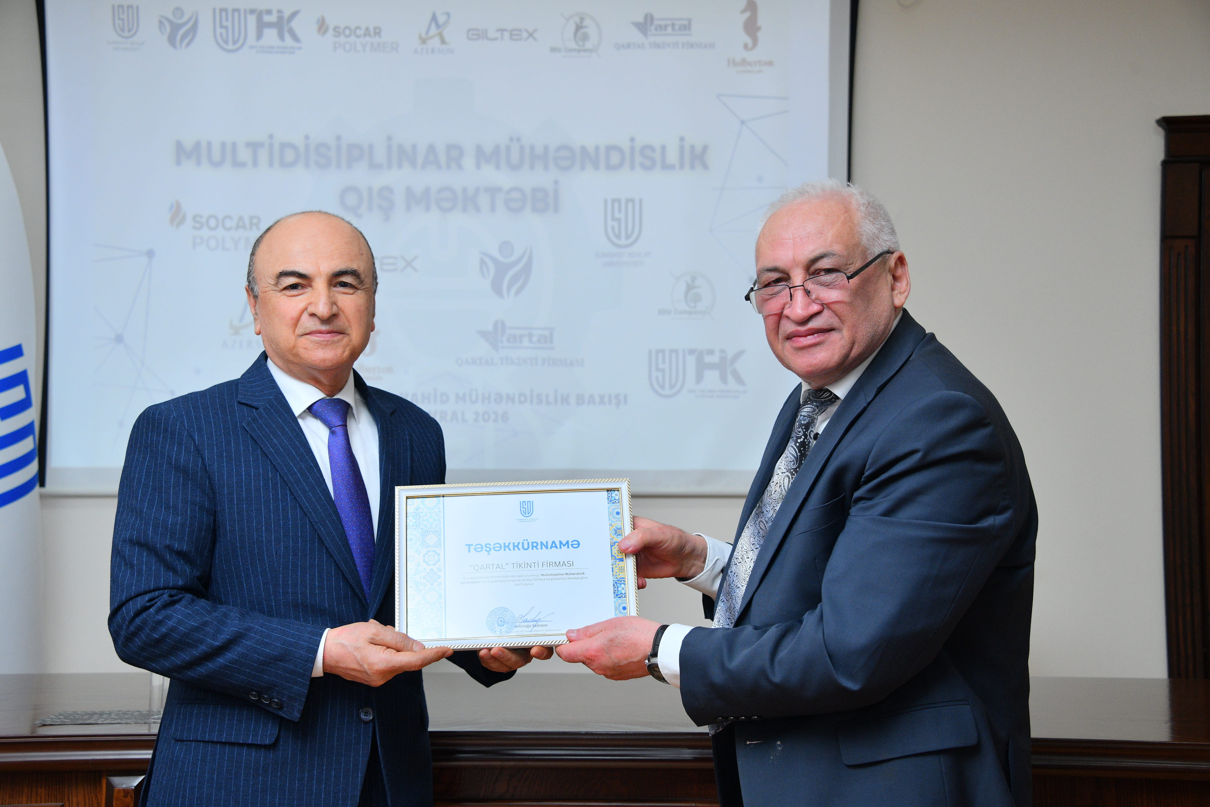 Tədbirdə çıxış edən “Qartal” tikinti şirkətinin direktoru Şahin Məmmədov rəhbərlik etdiyi qurumun həyata keçirdiyi layihələr barədə məlumat verib, SDU ilə əməkdaşlığın real sektor üçün ixtisaslı kadr hazırlığı baxımından əhəmiyyətini vurğulayıb. Digər tərəfdaş müəssisələrin nümayəndələri də bu cür təşəbbüslərin davamlı xarakter daşımasının vacibliyini qeyd edərək universitetlə əməkdaşlığın genişləndirilməsində maraqlı olduqlarını bildiriblər. Mühəndislik fakültəsinin dekanı, dosent Ulduz Ağayev Qış Məktəbi çərçivəsində tələbələrin nümayiş etdirdiyi fəallığı yüksək qiymətləndirərək qeyd edib ki, əldə olunan bilik və praktik təcrübə onların peşəkar kompetensiyalarının formalaşmasında mühüm rol oynayacaq. Sonda Qış Məktəbinin təşkilinə dəstək göstərən “SOCAR Polymer”, “GİLTEX”, “Azərsun Holding”, “Qartal” tikinti firması, “EDU Company” və “Holberton School” tərəfdaş qurumlara təşəkkürnamələr təqdim olunub, fəal iştirak edən tələbələr sertifikatlarla təltif edilib. Beləliklə, Multidisiplinar Mühəndislik Qış Məktəbi SDU-da elmi-pedaqoji mühitin gücləndirilməsi, universitet–sənaye əməkdaşlığının institusional əsasda inkişafı və müasir çağırışlara cavab verən mühəndis kadrların hazırlanması istiqamətində atılan ardıcıl addımların mühüm tərkib hissəsi kimi dəyərləndirilir.