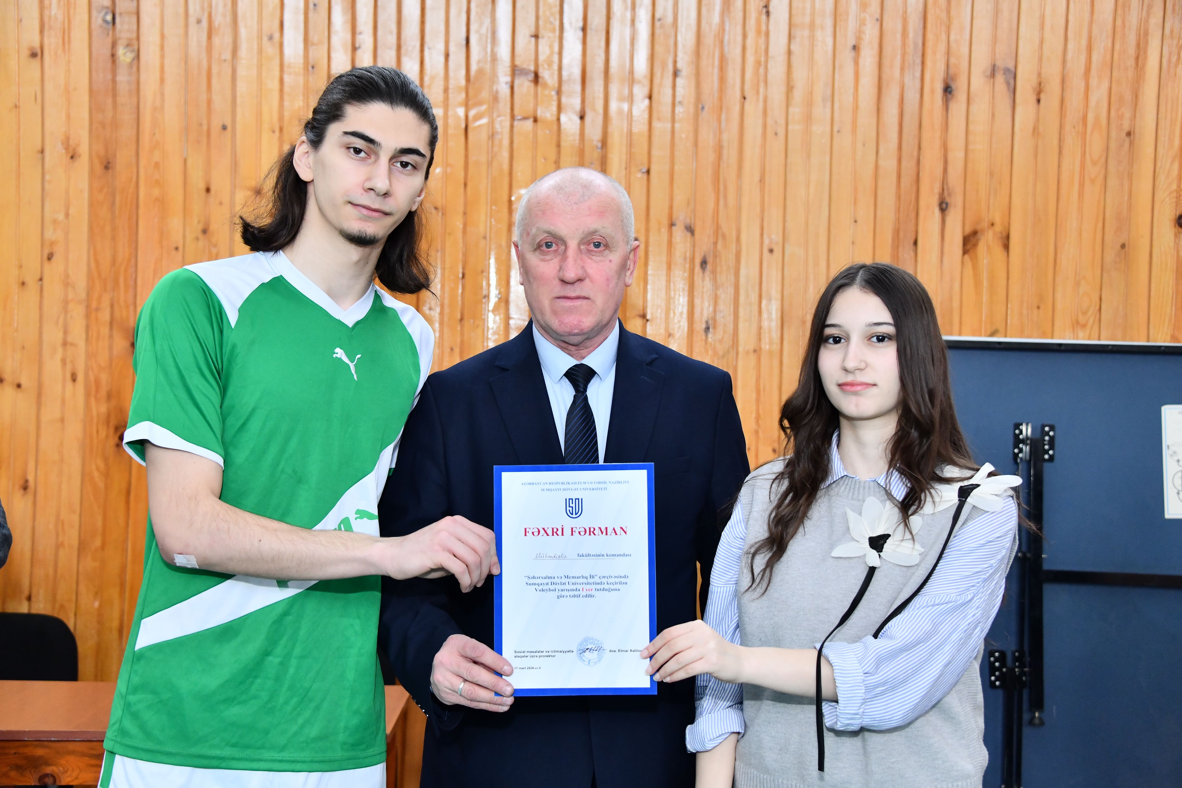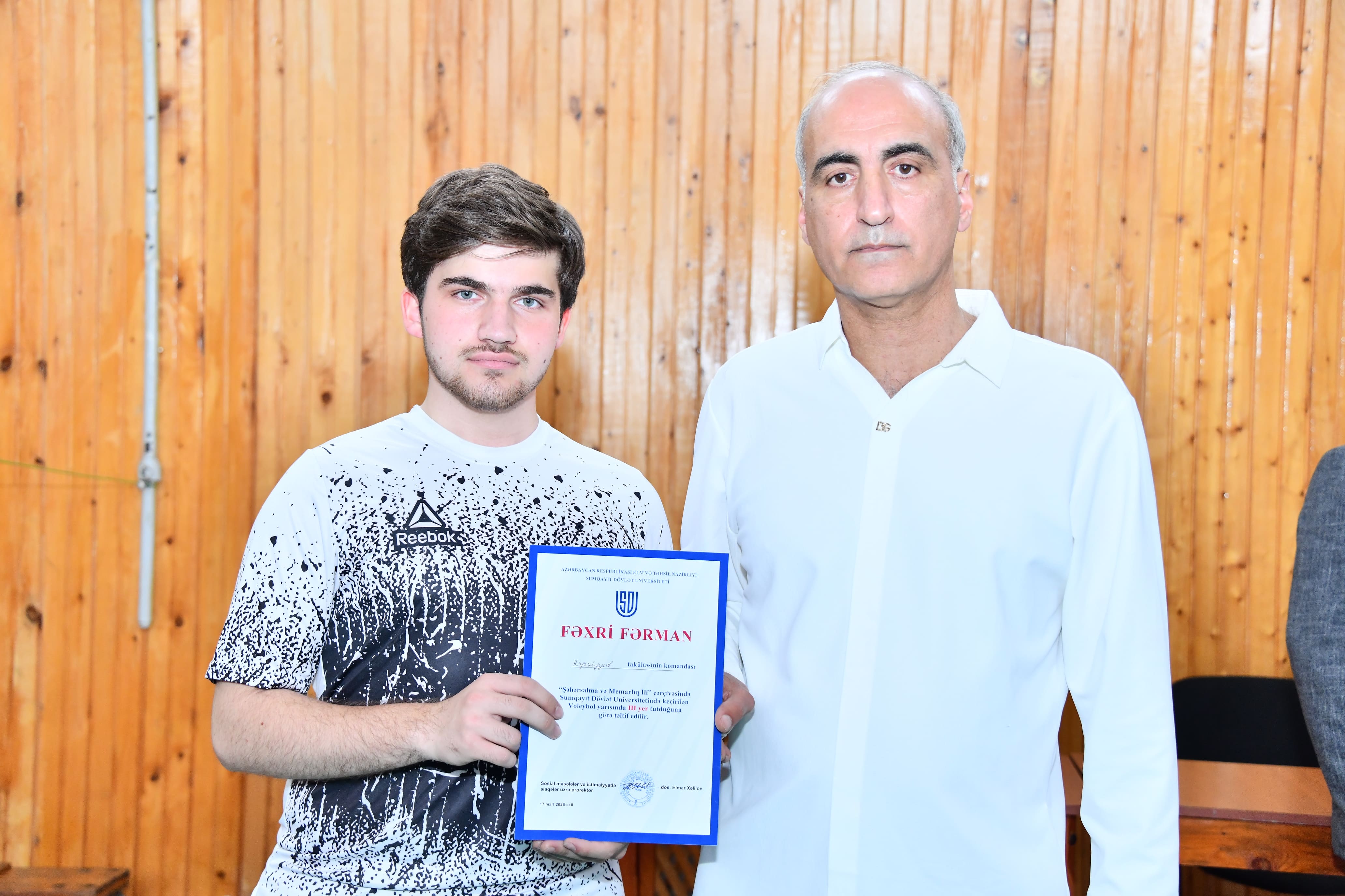 Martın 17-də Sumqayıt Dövlət Universitetində “Şəhərsalma və Memarlıq İli” çərçivəsində təşkil olunan fakültələrarası voleybol yarışı uğurla başa çatıb. Yarış universitetin Həmkarlar İttifaqı Komitəsi və İdman Klubunun birgə təşəbbüsü ilə həyata keçirilib. Tədbiri Sosial məsələlər və ictimaiyyətlə əlaqələr üzrə prorektor, dosent Elmar Xəlilov açaraq iştirakçıları universitetin rektoru v.i.e., AMEA-nın müxbir üzvü Əminağa Sadıqovun adından salamlayıb və onları qarşıdan gələn Novruz və Ramazan bayramları münasibətilə təbrik edib. Bildirib ki, belə idman yarışları tələbələr arasında sağlam həyat tərzinin formalaşmasına xidmət etməklə yanaşı, “sağlam bədəndə sağlam ruh olar” prinsipini təşviq edir, eyni zamanda sağlam rəqabət mühitinin yaranmasına və gənclərin komanda ruhunda inkişafına töhfə verir. Martın 7-də start götürən turnir gərgin və maraqlı qarşılaşmalarla yadda qalaraq uğurla başa çatıb. Yarışın yekun nəticələrinə əsasən, ən yüksək nəticəni göstərən Mühəndislik fakültəsi birinci yerə yüksəlib. Tarix və coğrafiya fakültəsi uğurlu çıxışı ilə ikinci yerə, Riyaziyyat fakültəsi isə üçüncü pillədə qərarlaşıb. Sonda qalib komandalar sertifikatlarla təltif olunublar.