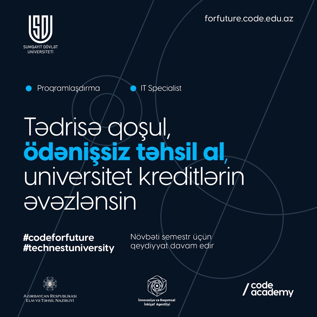 Elm və Təhsil Nazirliyi, “Code Academy” və İnnovasiya və Rəqəmsal İnkişaf Agentliyinin Sumqayıt Dövlət Universiteti (SDU) ilə birgə həyata keçirdiyi #codeforfuture layihəsi &cc... Davamı