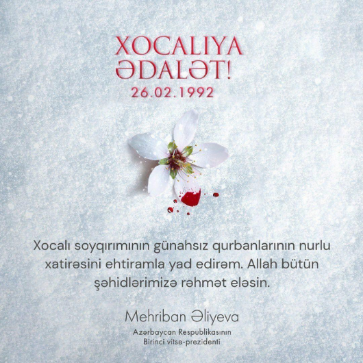 Azərbaycan Respublikasının Birinci vitse-prezidenti Mehriban Əliyeva rəsmi instaqram səhifəsində Xocalı soyqırımı ilə bağlı foto paylaşıb.